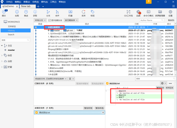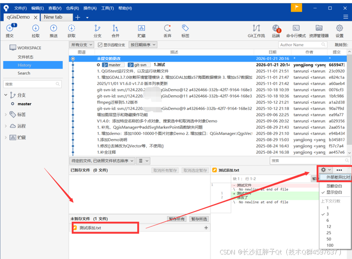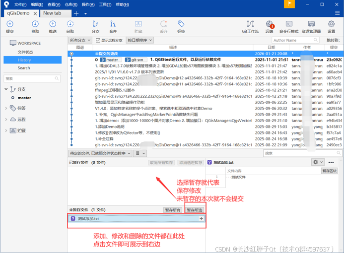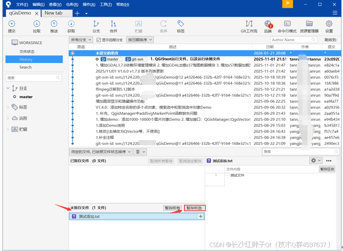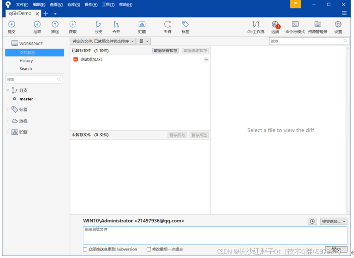 这里很方便,可以暂存所有,暂存选择的文件,暂存选择的文件中的代码块,这块远超其他管理工具,也是我们使用sourceTree最重要的原因之一: