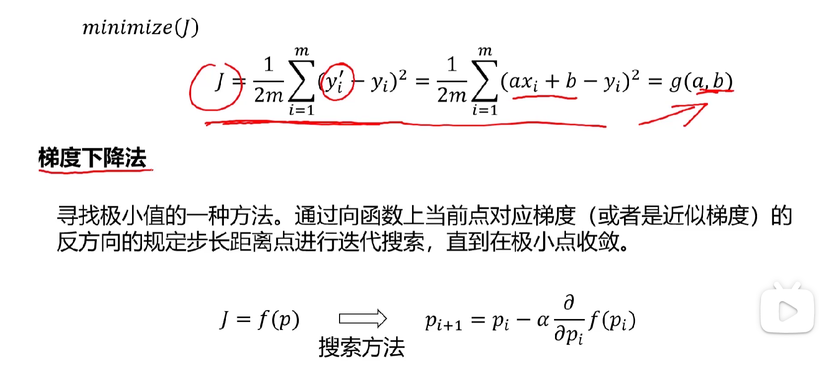 假如x为变量,y为实际的结果,而y'为模型输出的结果,转换目标,通过调整a、b使y'尽可能能得靠近y。