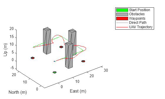 legend(["Start Position","Obstacles","","","Waypoints","","","Direct Path","UAV Trajectory"])