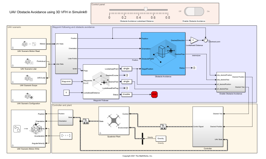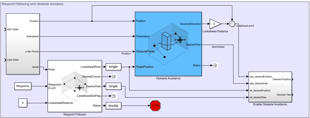 >> openExample('uav/UAVObstacleAvoidanceInSimulinkExample')