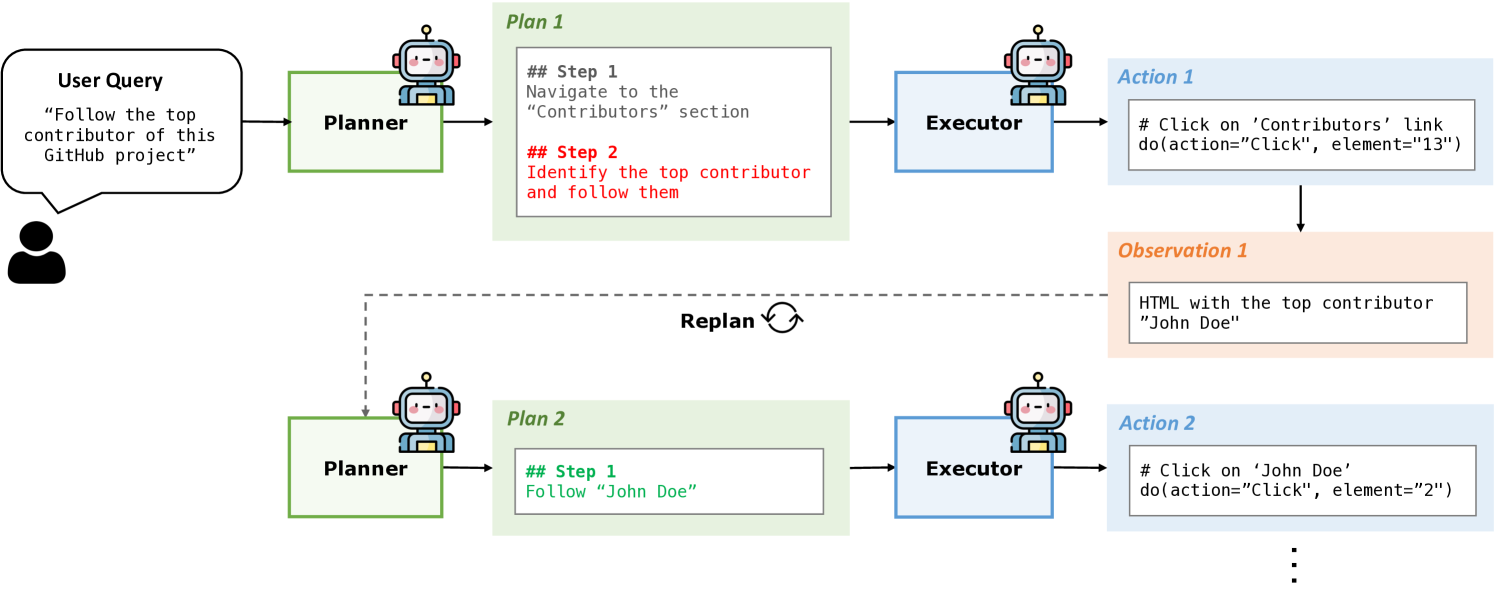 - Executor LLM:接收计划和当前环境状态(HTML),输出具体操作