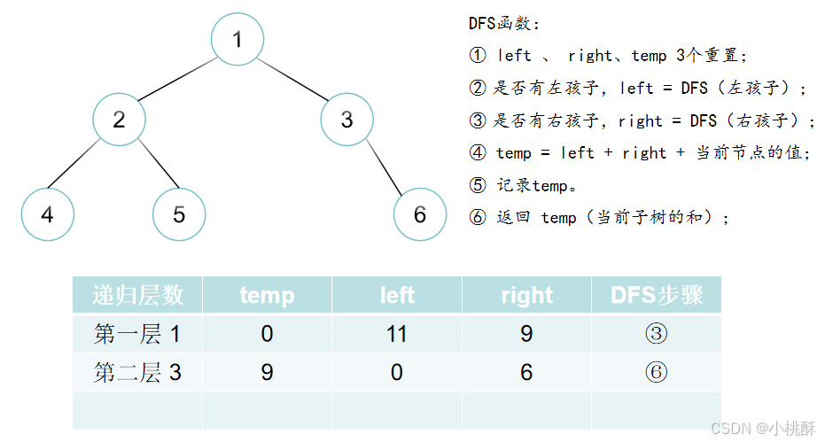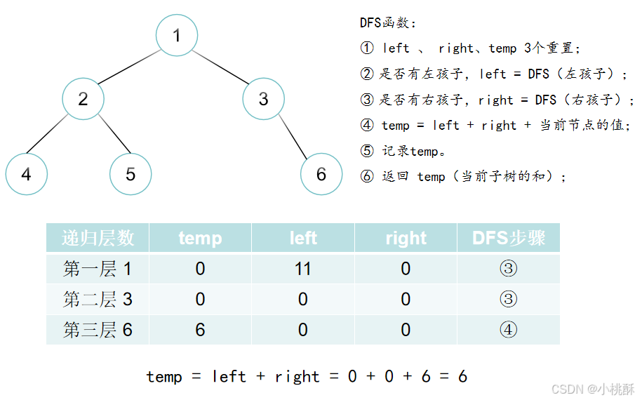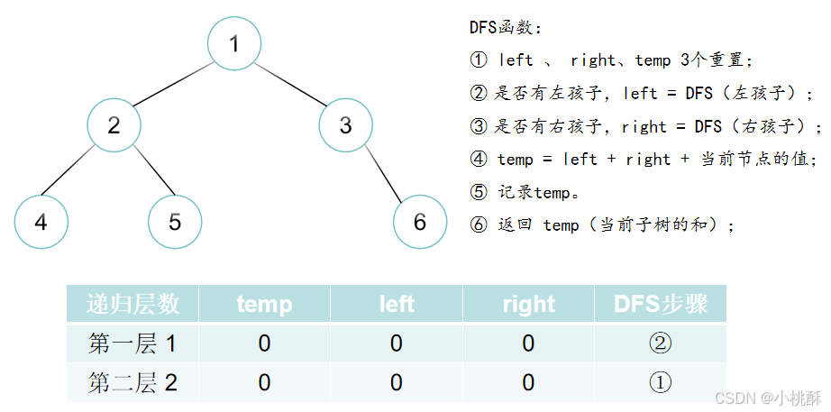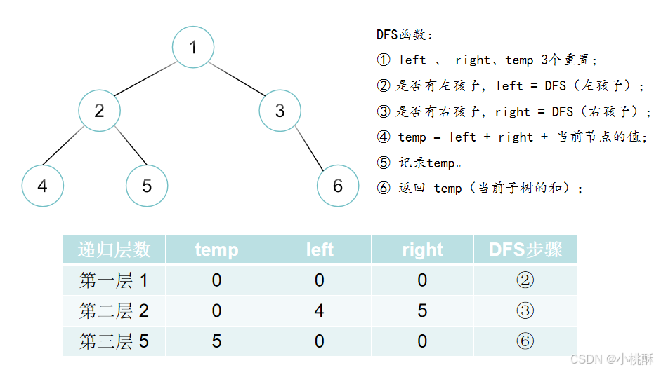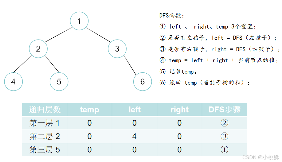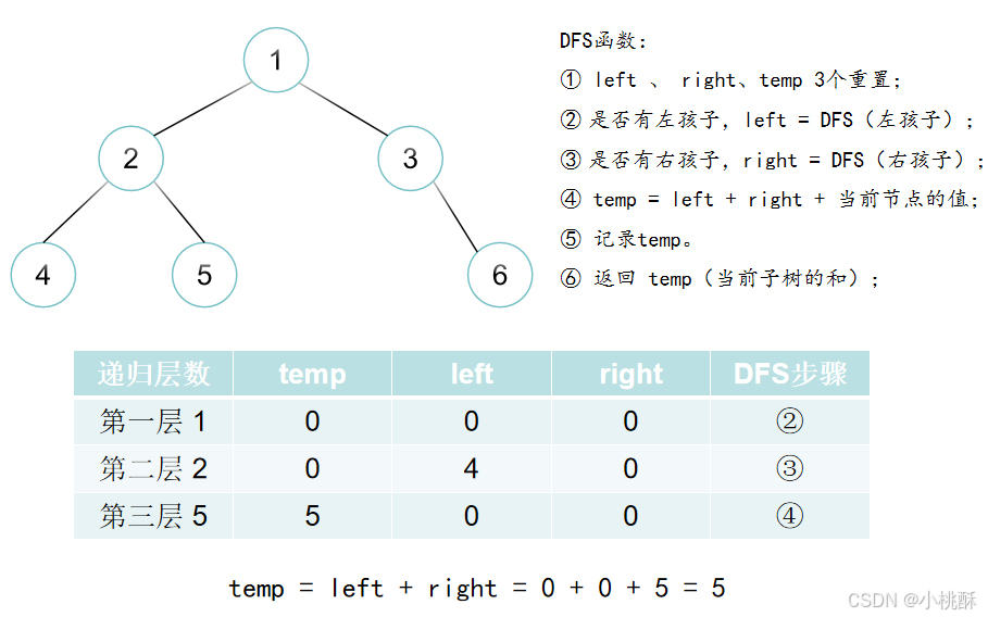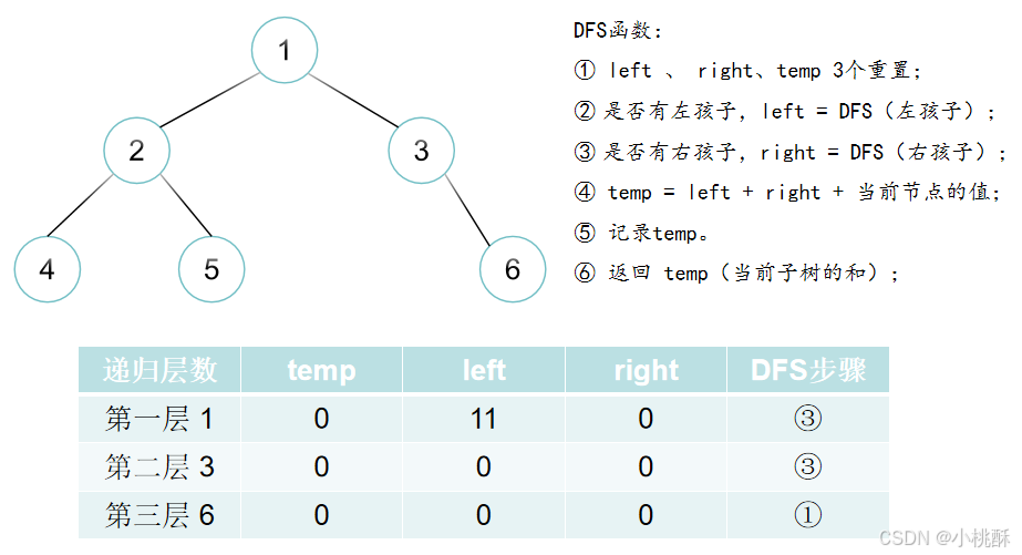 解析:根节点调用 DFS 函数的时候,会一直嵌套直到找到二叉树**最左边的那个叶子节点,**接下来,由于 left 和 right 为 0,那么 temp = 0 + 0 + 当前节点的值,将 temp 返回至上一层,也就是当前节点的父亲节点,父亲节点已经完成了 ② ,在这一层 left 的值是刚才计算得到的 temp,接下来进行 ③ ,如果没有右孩子那么 right = 0,在这一层的 temp = left + 0 + 当前节点的值,结束这层循环,再返回上一层。