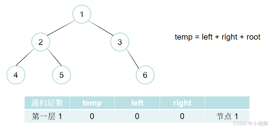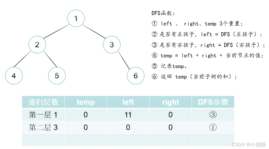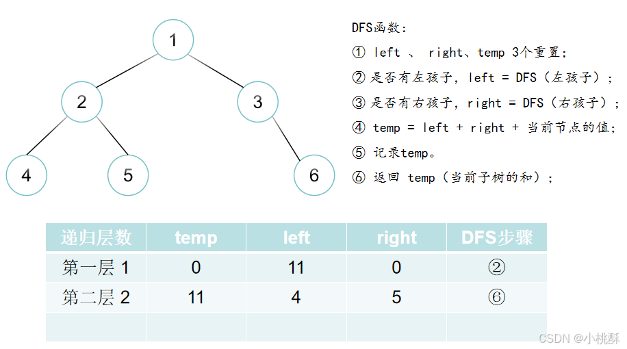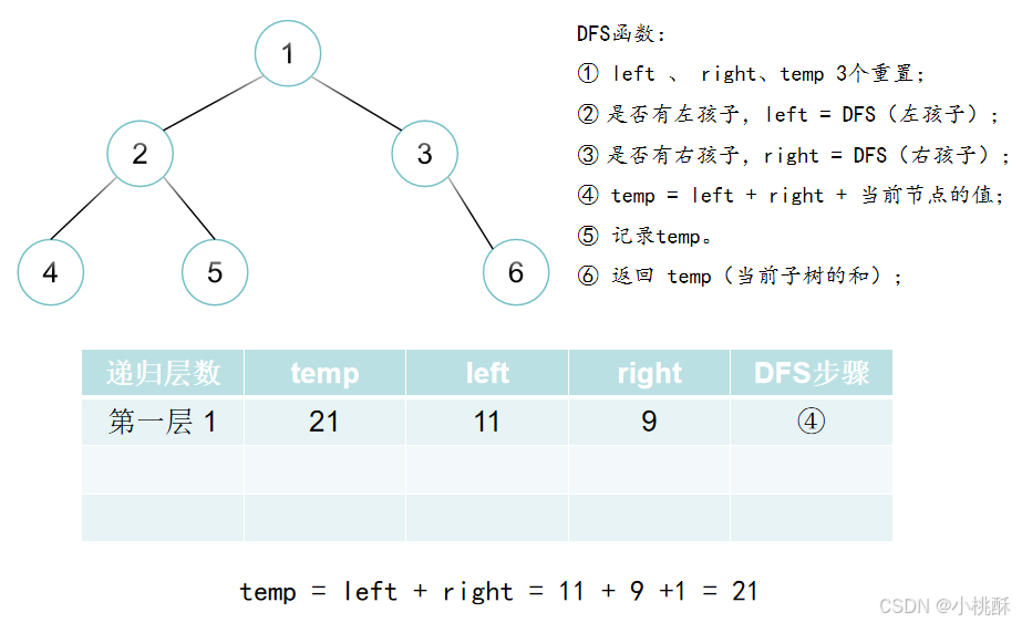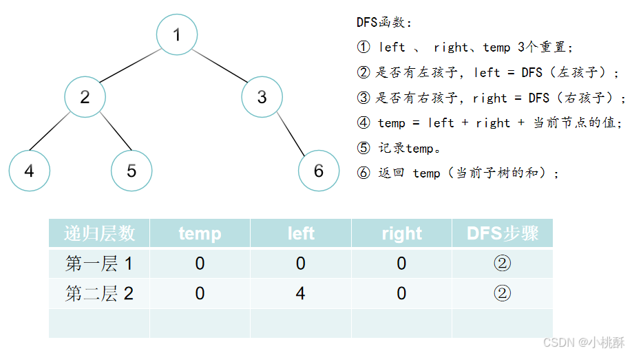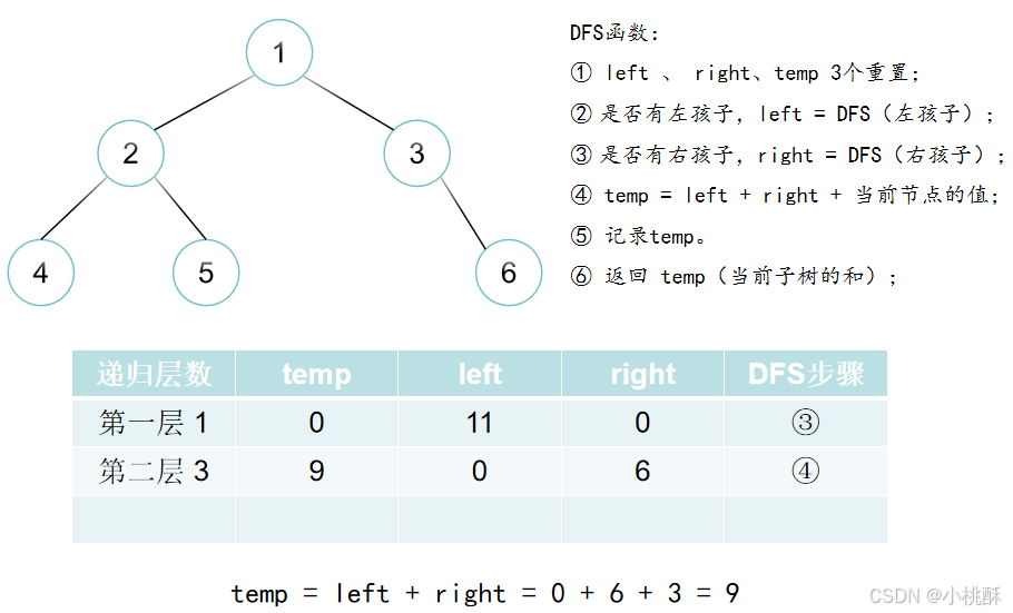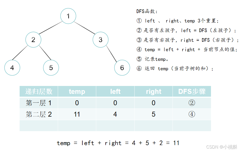 解析:根节点调用 DFS 函数的时候,会一直嵌套直到找到二叉树**最左边的那个叶子节点,**接下来,由于 left 和 right 为 0,那么 temp = 0 + 0 + 当前节点的值,将 temp 返回至上一层,也就是当前节点的父亲节点,父亲节点已经完成了 ② ,在这一层 left 的值是刚才计算得到的 temp,接下来进行 ③ ,如果没有右孩子那么 right = 0,在这一层的 temp = left + 0 + 当前节点的值,结束这层循环,再返回上一层。