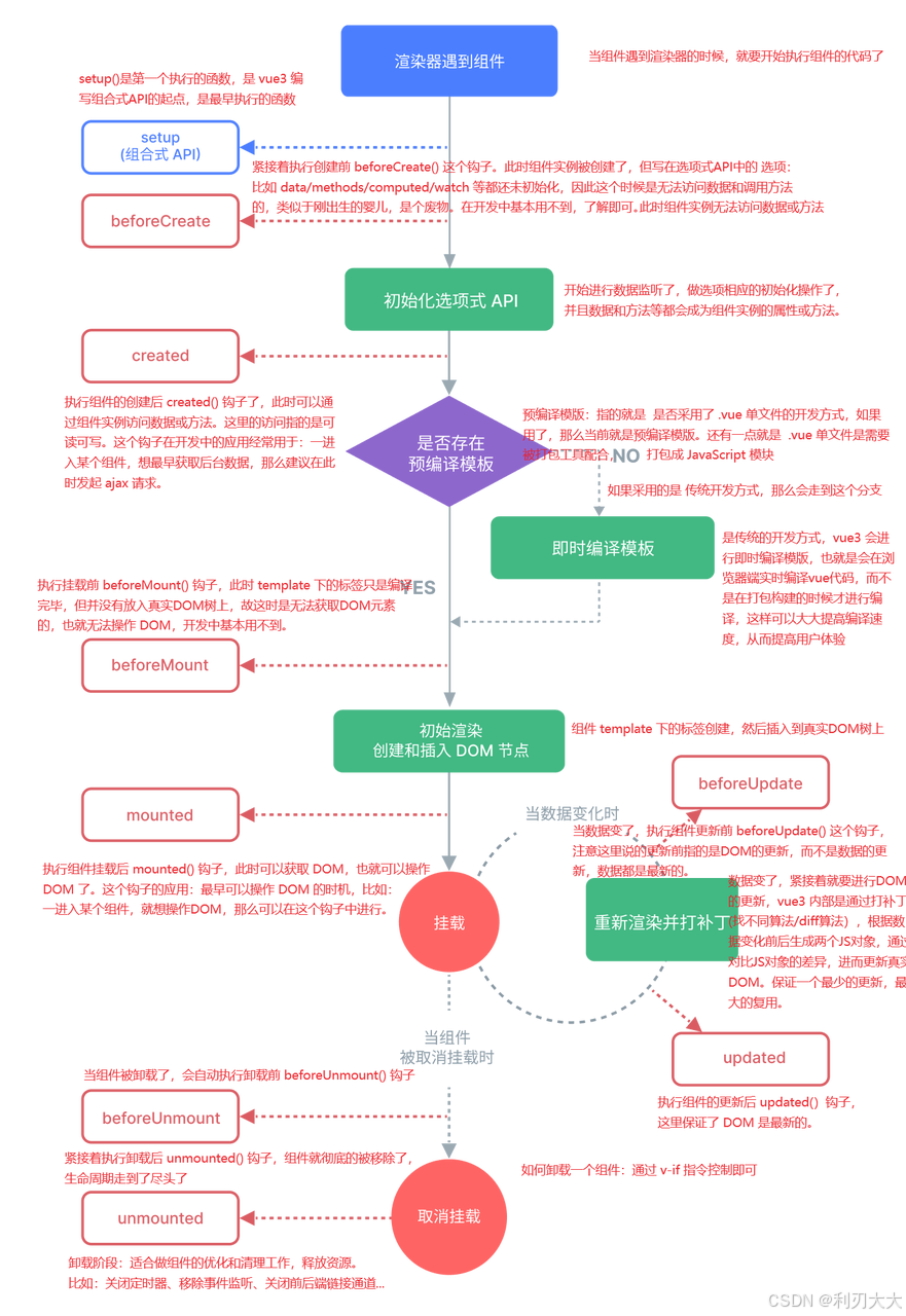 - 卸载:组件销毁、释放资源。