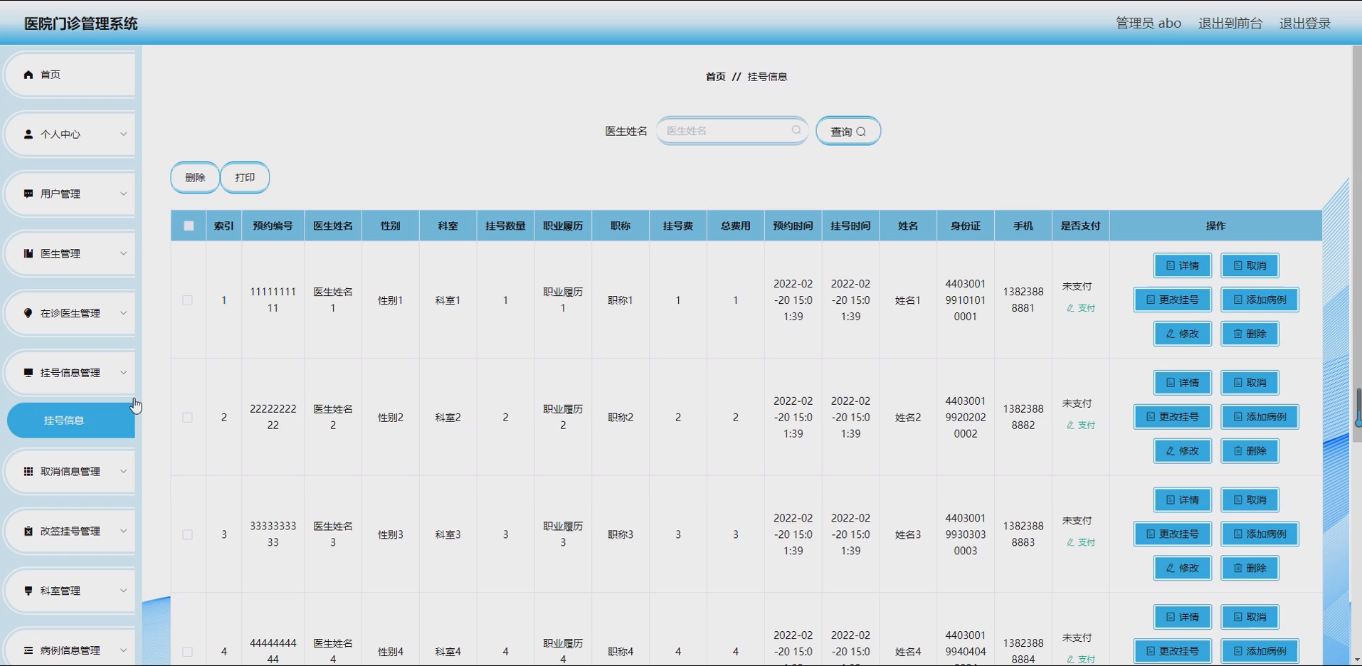挂号与取消管理模块:涵盖挂号信息、取消信息管理,实现用户在线挂号、一键取消挂号,系统自动记录挂号与取消信息,支持医生管理员查询、统计挂号及取消数据,优化挂号流程。