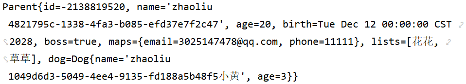 java# 配置文件占位符 parent: id: ${random.int} name: "zhaoliu \n ${random.uuid}" age: 20 birth: 2028/12/12 boss: true maps: {email: 3025147478@qq.com, phone: 11111} lists: - 花花 - 草草 dog: name: ${parent.name:wangwu}小黄 # 若没有配置parent下的name属性值,默认使用wangwu;若配置类值,则使用配置的值 age: ${random.int(3,5)} # 生成0到5之间的随机整数