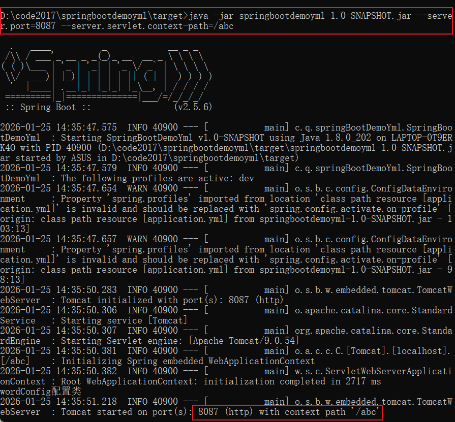 注意:在Spring Boot 2.x 之后,不在使用 --server.context-path 这个命令,而是使用 --server.servlet.context-path。java# java -jar 打包的项目名.jar --server.port=端口号 --server.servlet.context-path=路径 java -jar springbootdemoyml-1.0-SNAPSHOT.jar --server.port=8087 --server.servlet.context-path=/abc