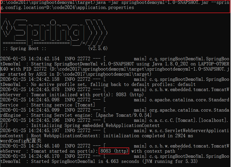 在D:\code2024\application.properties,放在一个配置文件(端口号:8083),在外部命令行中运行这个环境