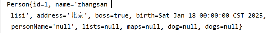 javaperson: # 普通属性 id: 1 name: "zhangsan \n lisi" address: 北京 boss: true birth: 2025/1/18 -