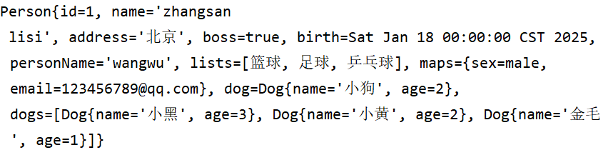 javapublic class Person { private Integer id; private String name; private String address; private Boolean boss; private Date birth; private String personName; private List<String> hobby; private Map<String,Object> maps; private Dog dog; // 嵌套对象 private List<Dog> dogs; // dog对象列表 // 提供无参构造、有参构造、Getter和setter对象,以及重新toString } public class Dog { private String name; private Integer age; // 提供无参构造、有参构造、Getter和setter对象,以及重新toString } -