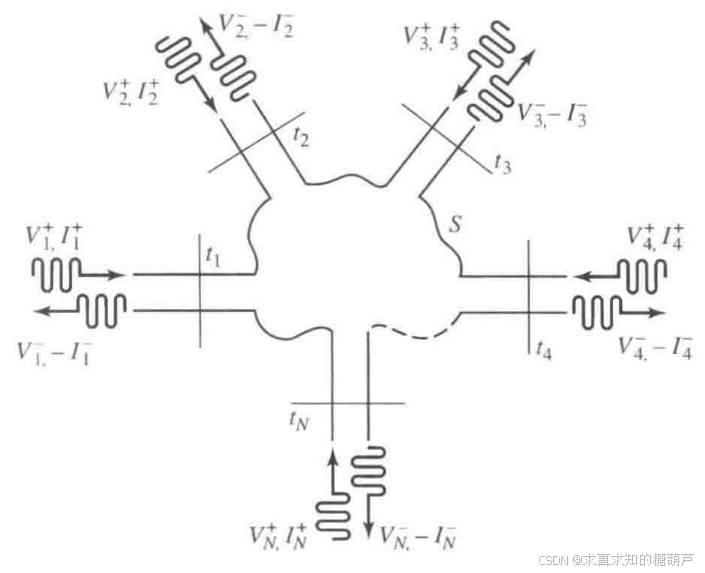 对于通用端口进行分析,我们在第n个端口上的一个指定点处,**定义了一个端平面 t n t_{n} tn,并定义了等效的入射波电压和电流( V n + , I n + V_{n}^{+},I_{n}^{+} Vn+,In+)及等效的反射波电压和电流( V n − , I n − V_{n}^{-},I_{n}^{-} Vn−,In−)。**在为电压和电流相量提供相位参考时,这些端平面的作用很重要。下面给出第n个端平面上的总电压和电流: