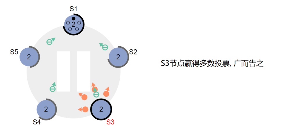 情况A(获胜) :收到超过半数投票,成为Leader,并立即广播心跳确立地位。