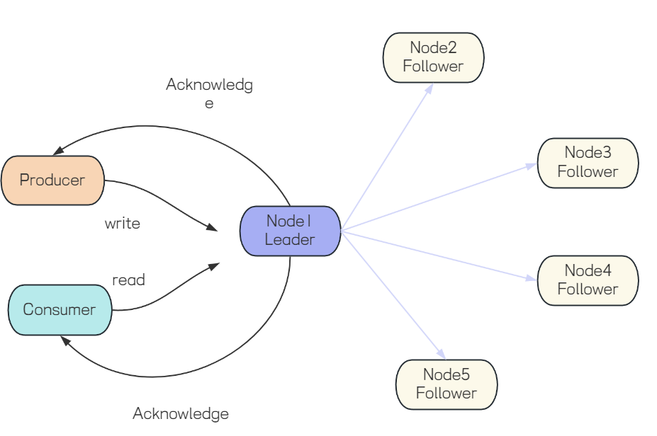 AppendEntries RPC给所有Follower发送复制请求。3、当超过半数的Follower回复确认后,Leader即认为该日志条目已提交,可以安全地应用到状态机(如存储消息),并回复客户端成功。