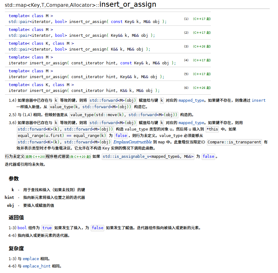 c++官方网站对该特性的介绍:std::map<Key,T,Compare,Allocator>::insert_or_assign - cppreference.cn - C++参考手册