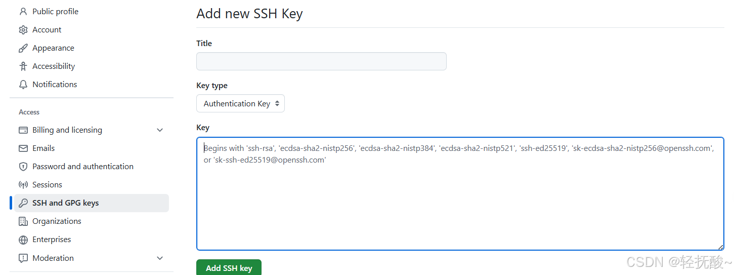 - 将公钥复制到 github 上,给这个公钥取个名字然后保存即可