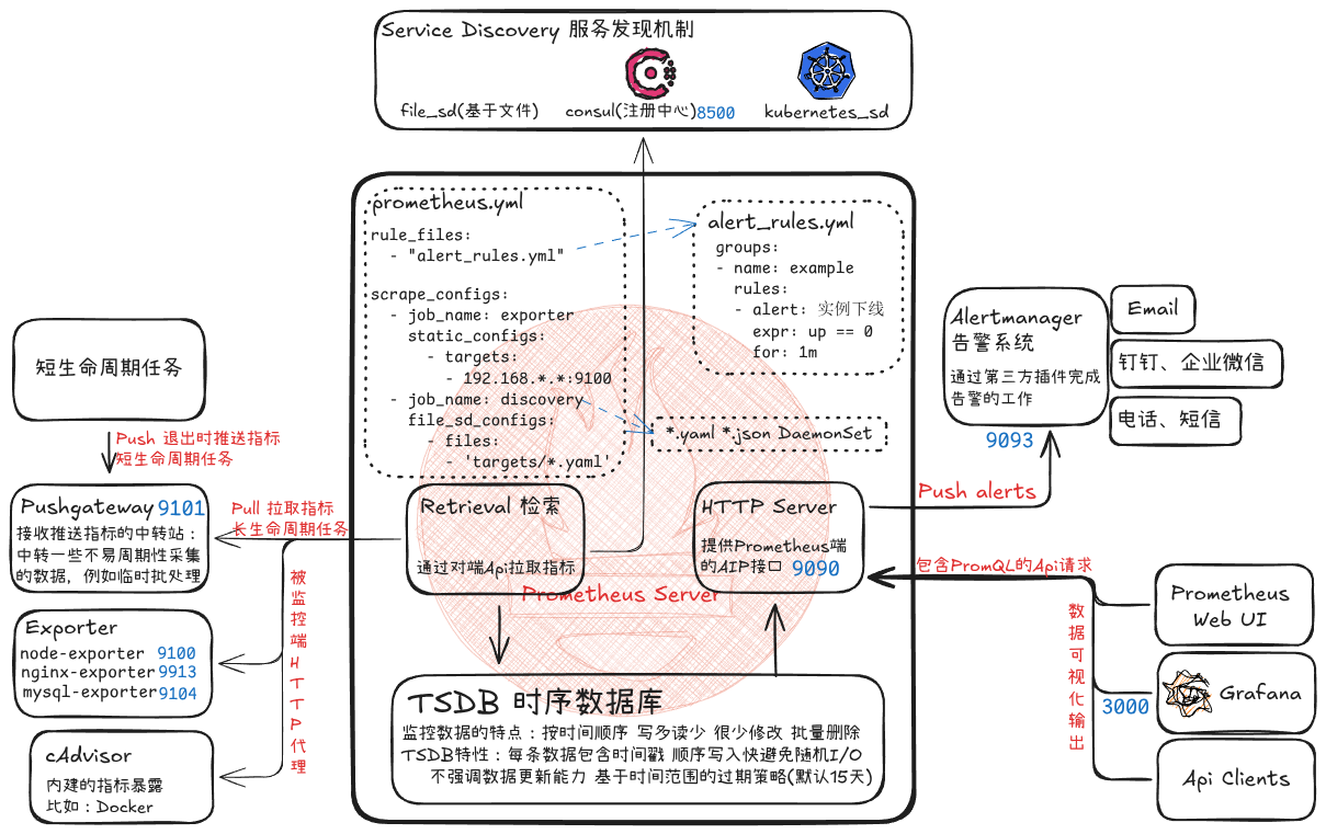 Prometheus 工作流程 :Exporter / Pushgateway → Prometheus拉取 → TSDB存储 → PromQL查询 → Grafana展示 → Alertmanager告警通知