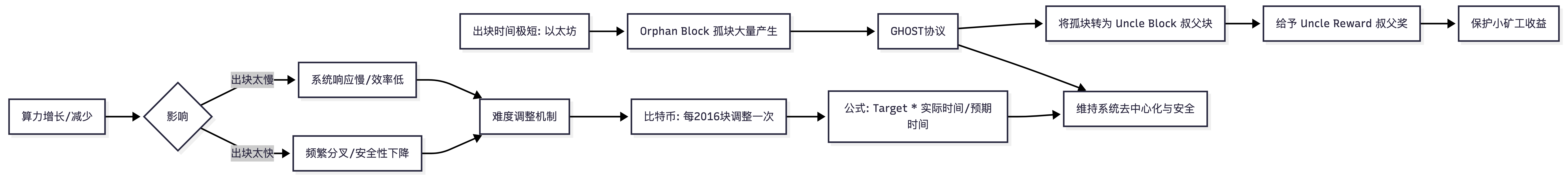 - 如果不调整: 随着计算机算力(哈希率)的提升,出块时间会越来越短。这会导致区块链频繁分叉,不仅降低系统安全性(容易受到攻击),还会造成大量的计算资源浪费。