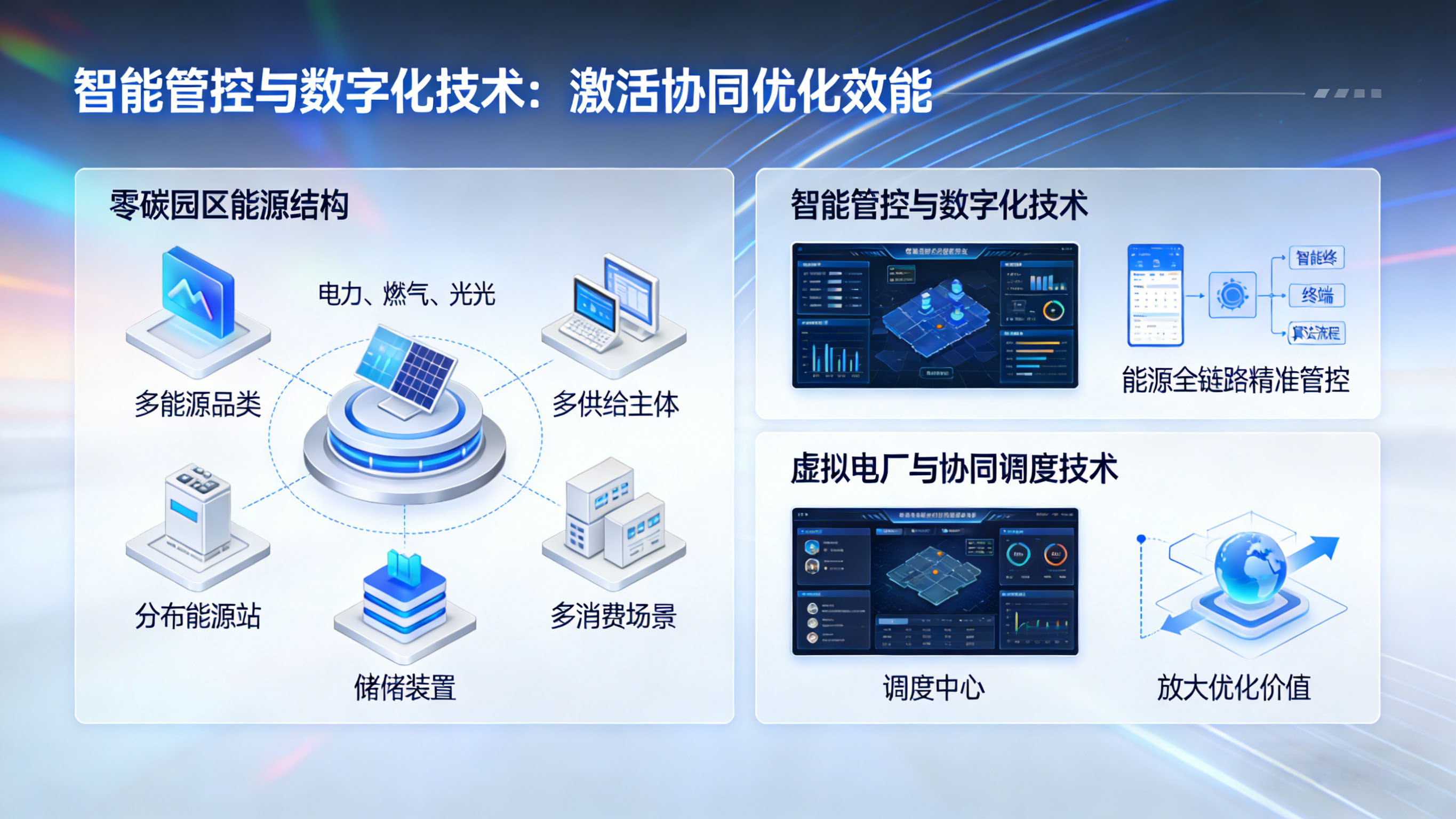 零碳园区能源结构复杂,涉及多能源品类、多供给主体、多消费场景,需依托数字化、智能化技术,实现能源全链路的精准管控与协同优化。