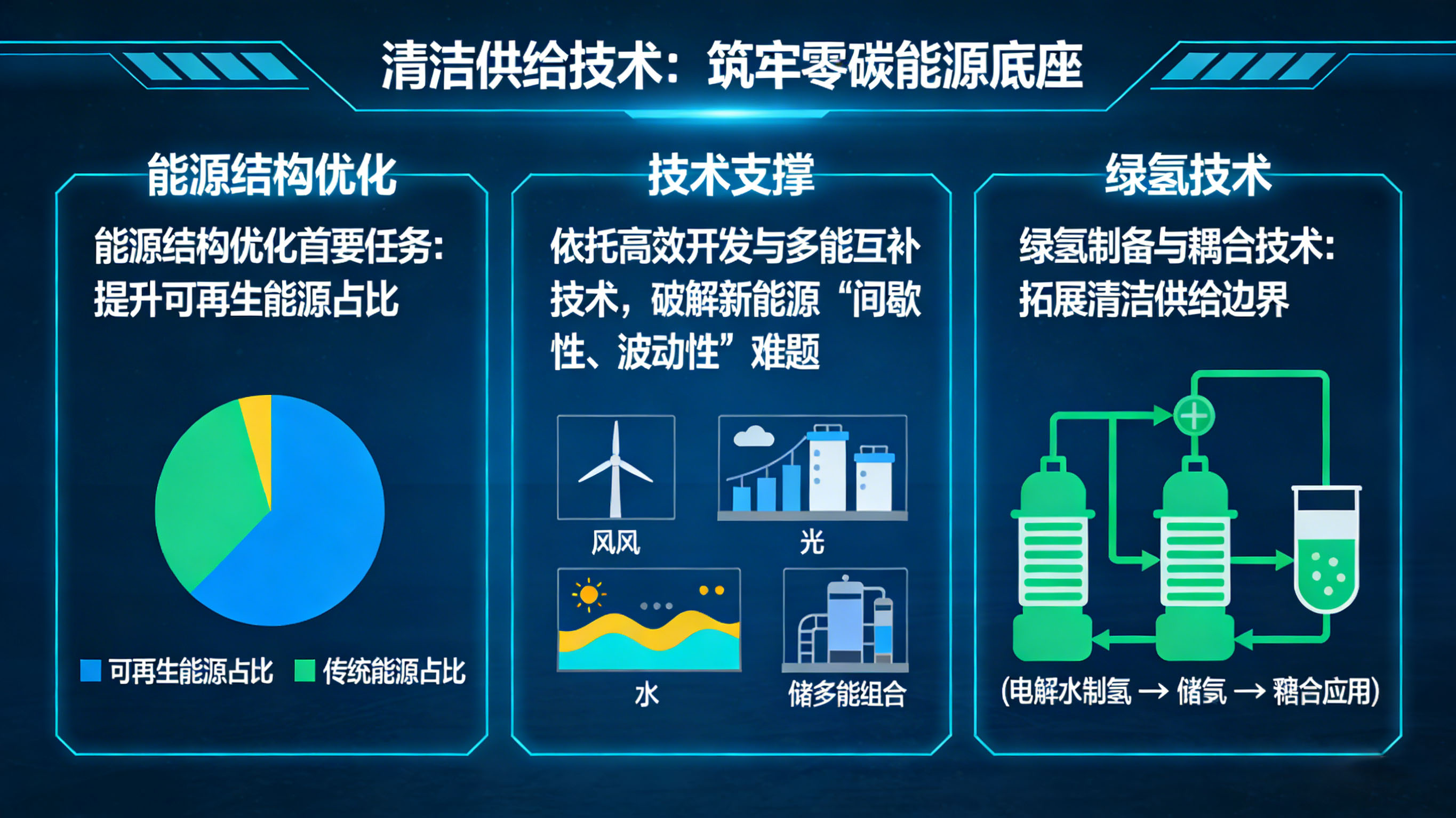 能源结构优化的首要任务是提升可再生能源在总能耗中的占比,需依托高效开发与多能互补技术,破解新能源"间歇性、波动性"难题,构建稳定可靠的清洁供给体系。