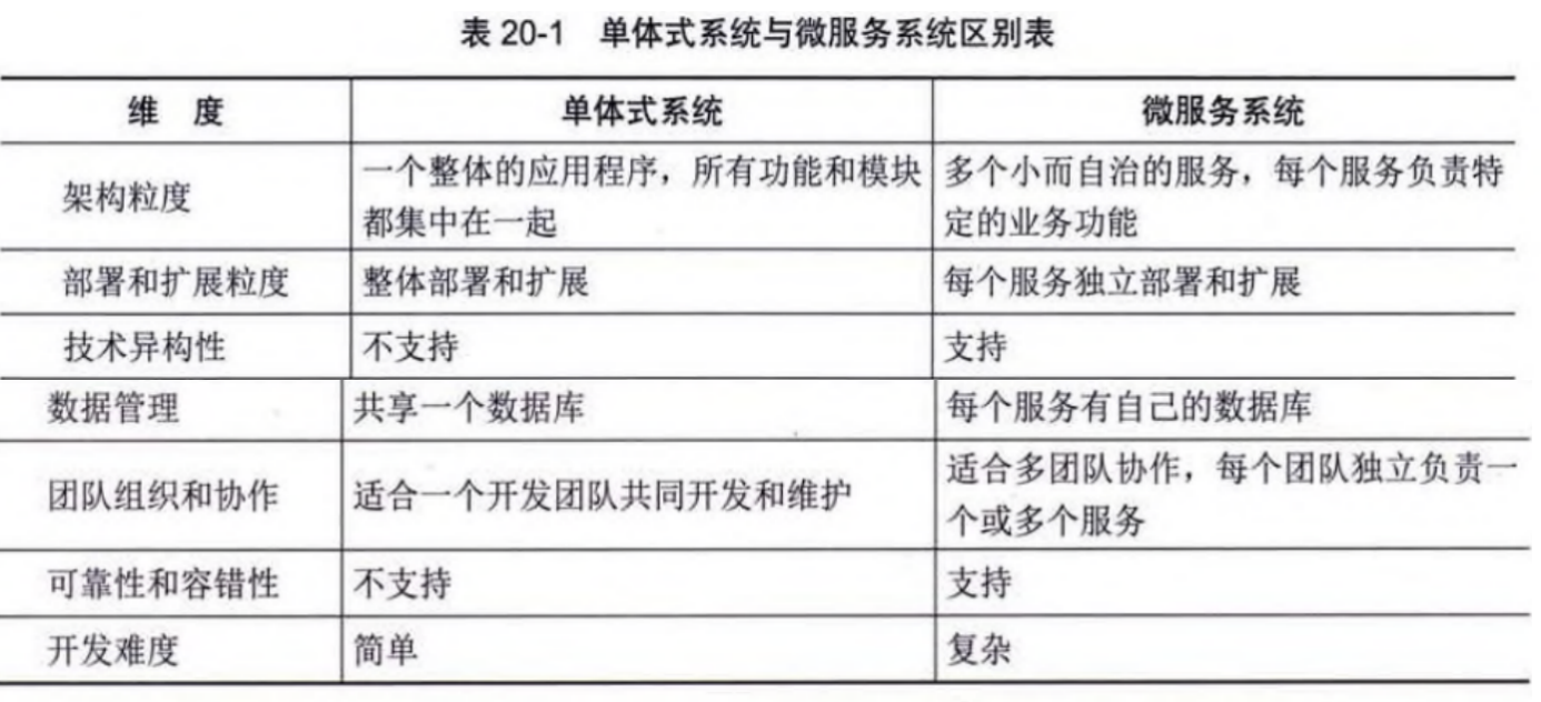 在微服务架构被提出之前,传统的Web开发方式为单体式开发。单体式系统表示一个应用程序内包含了所有需要的业务功能,每个业务功能都是不可分割的。其与微服务区别如下: