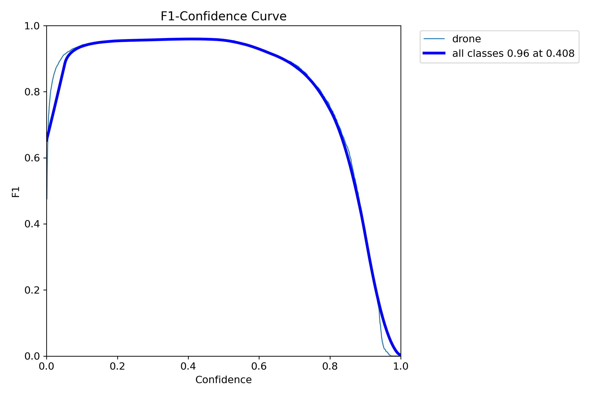 当置信度为0.408时,所有类别的综合F1值达到了0.96(蓝色曲线)。