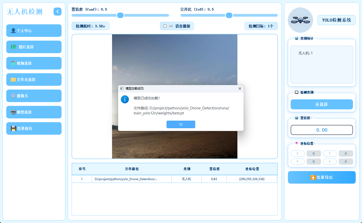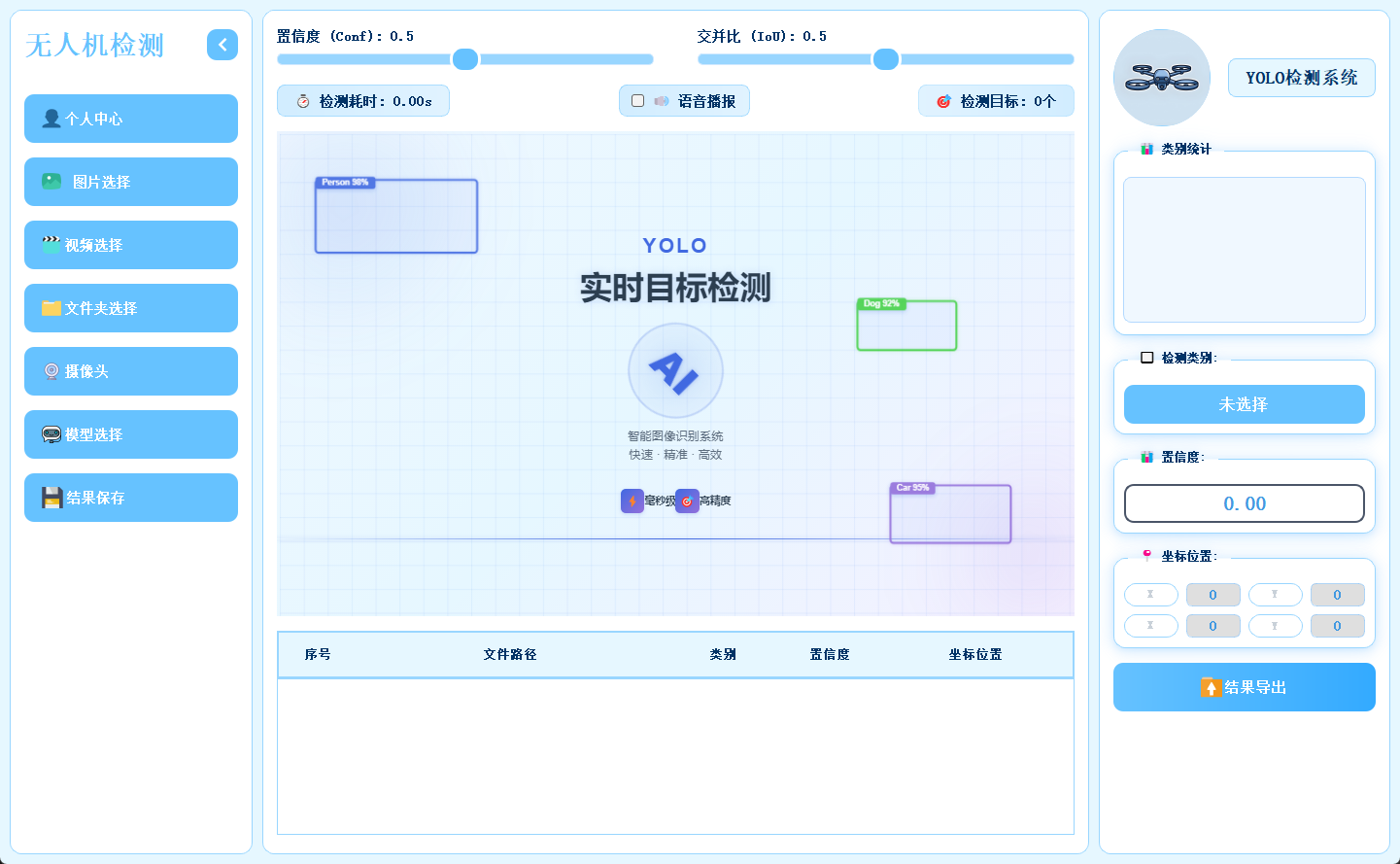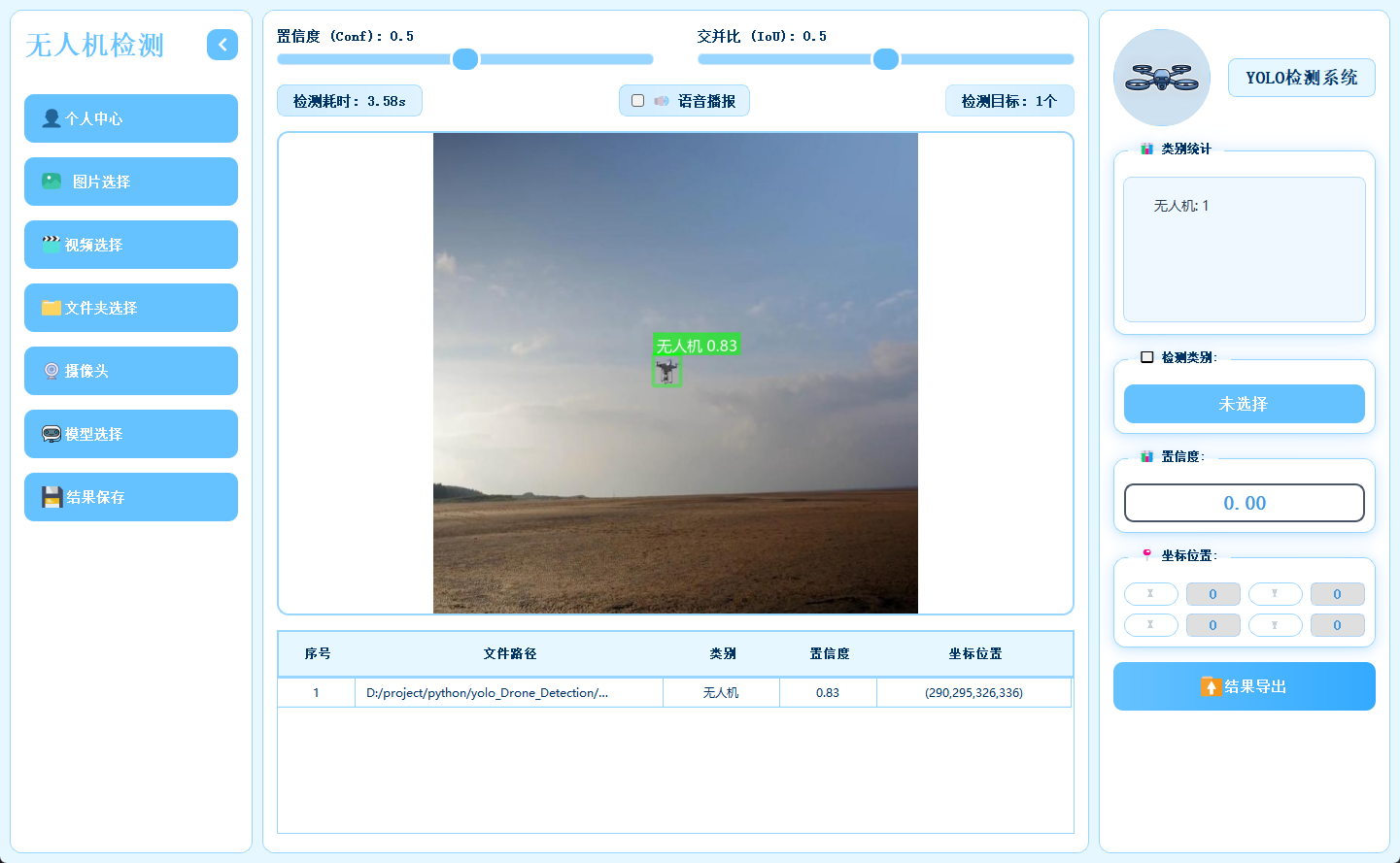 近年来,无人机在物流配送、农业植保、安防巡检等领域的应用日益广泛,随之而来的空域安全问题也愈发凸显------未经授权的无人机闯入机场净空区、敏感设施上空或人群密集场所,可能引发严重的安全隐患与隐私风险。然而,传统的无人机检测方法多依赖雷达或射频信号监测,存在设备成本高、环境适应性差、对小目标识别率低等问题;部分视觉检测方案则局限于静态图片或单一视频源,难以满足实时监控、多场景巡检及批量数据分析的需求。随着深度学习技术的发展,YOLO 系列目标检测算法 凭借其毫秒级推理速度与高精度特性,为动态环境下的无人机实时检测提供了全新思路。为此,我们本期推出 基于 YOLO 算法的无人机检测系统------它不仅能支持图片、视频、文件夹批量处理及实时摄像头流检测,还内置多版本模型切换、置信度与交并比调节、检测耗时与数量统计、类别统计、单目标详情展示、结果保存与 Excel 导出、语音播报及用户登录管理功能,并配套无界面脚本化调用与模型训练模块,帮助安防人员、空域管理者及开发者在不同场景下实现高效、可复用的无人机目标检测与数据管理。