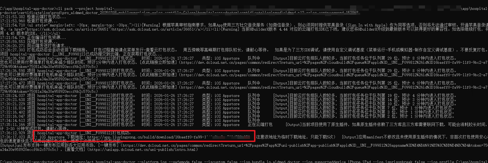 注意: cli 的配置只需要在第一次的时候需要,后续直接通过操作步骤中的命令直接打包即可,如果证书有更换,请注意及时变更命令中对应的证书路径,发版的时候记得更改环境信息和版本信息。