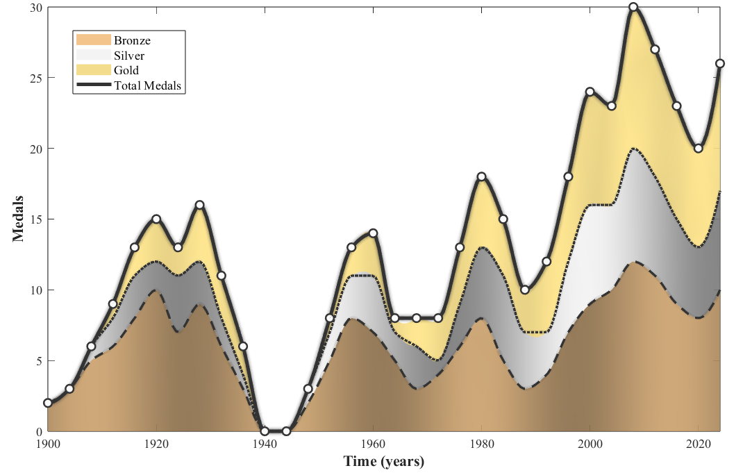 total_interp = interp1(years, total_medals, years_interp, 'pchip');