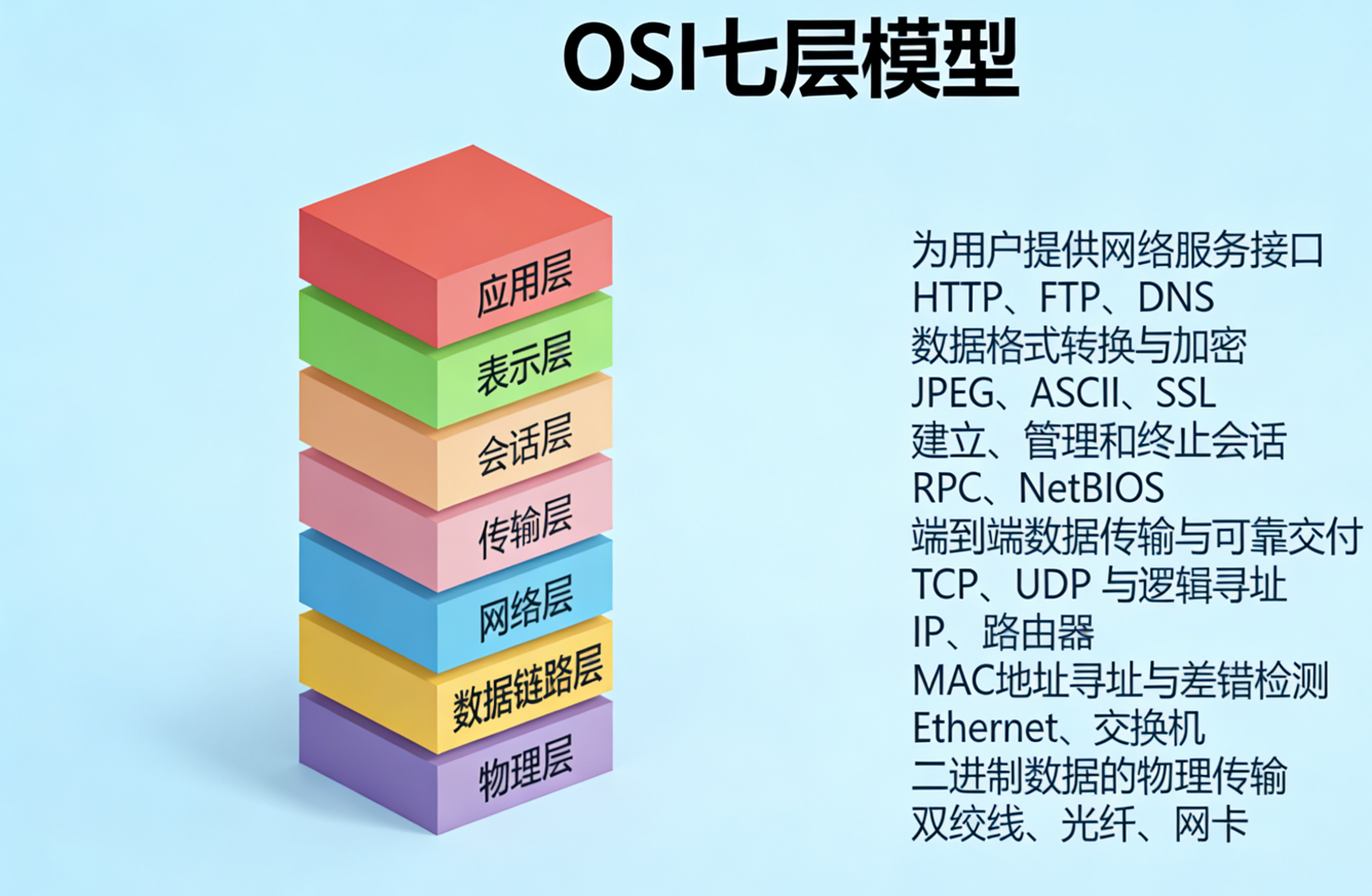 | 层次(从下到上) | 名称 | 对应 OSI 层次 | 核心功能 | 典型协议 |