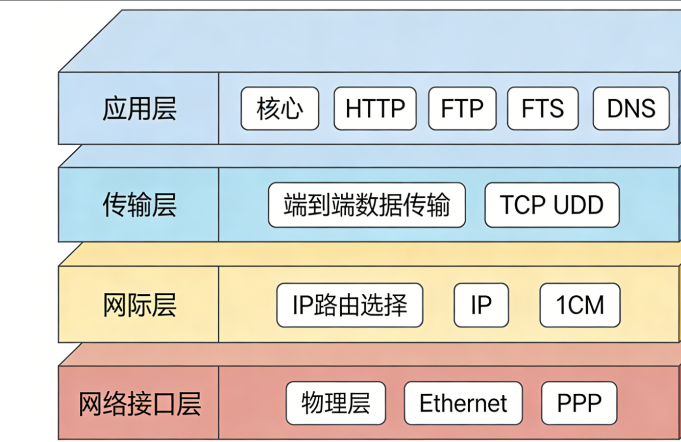 | 第 1 层 | 网络接口层 | 数据链路层 + 物理层 | 物理介质传输、帧封装与传输 | Ethernet、PPP、Wi-Fi |