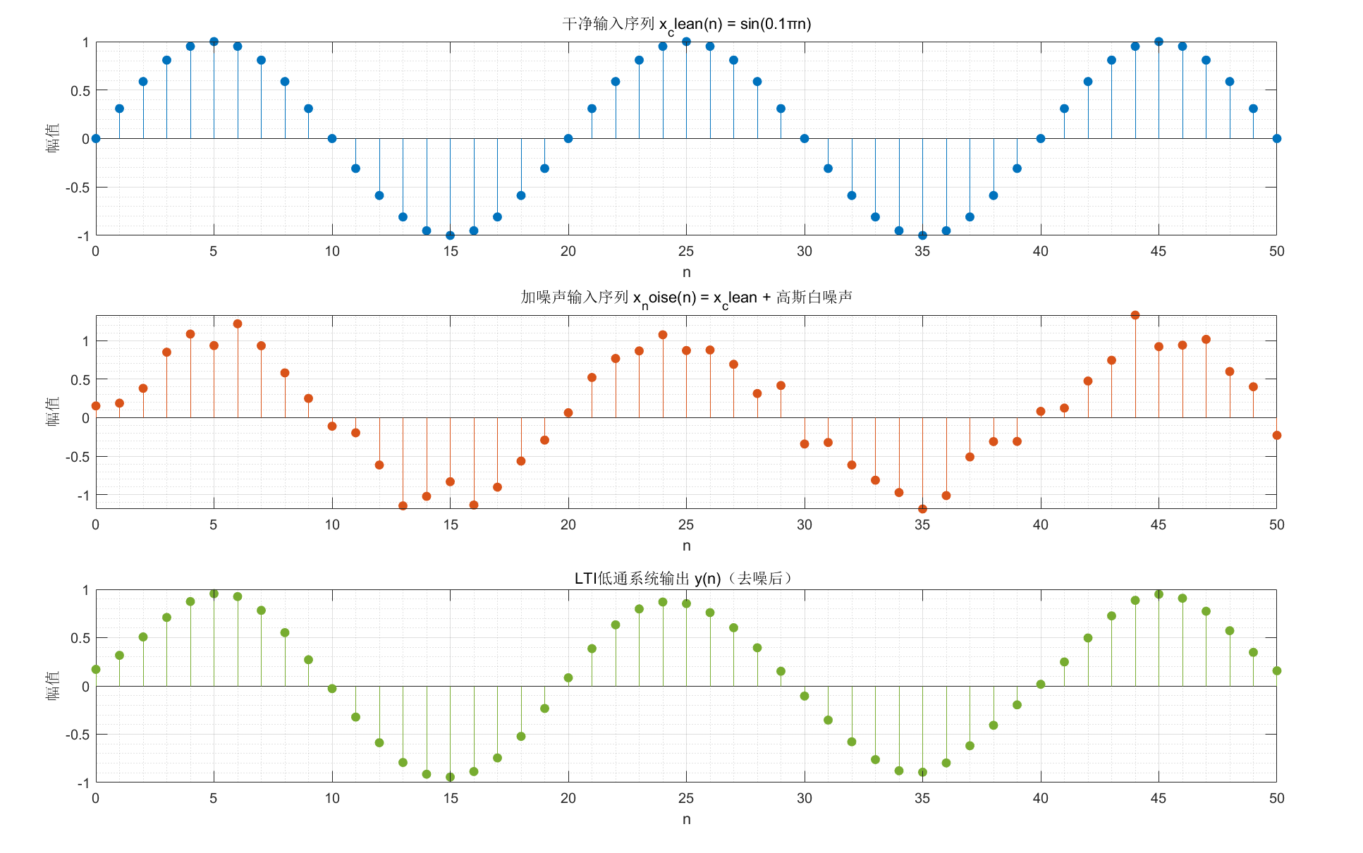 % ========== 需求:带噪声正弦序列通过LTI低通系统去噪 ==========