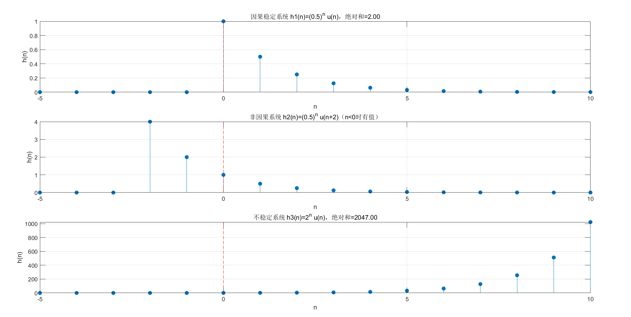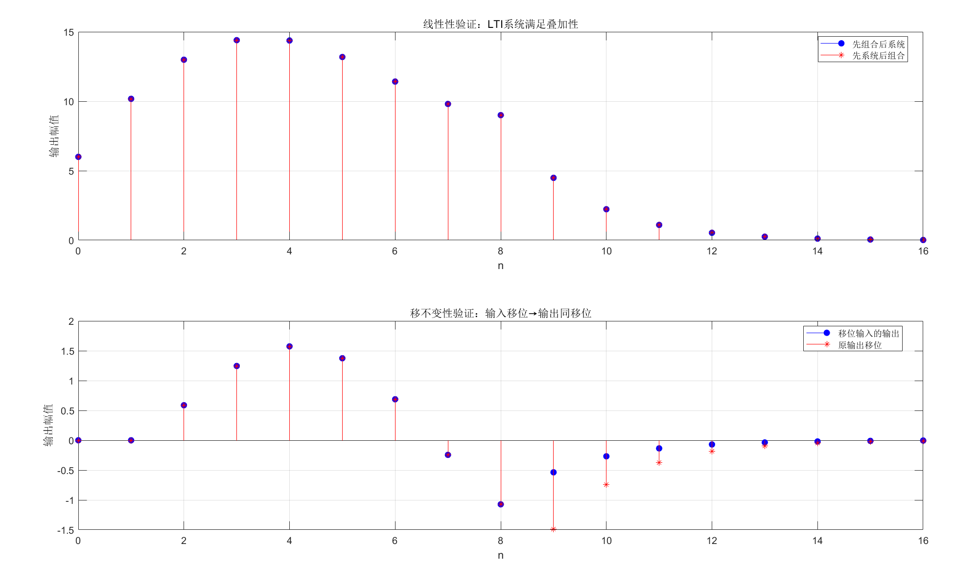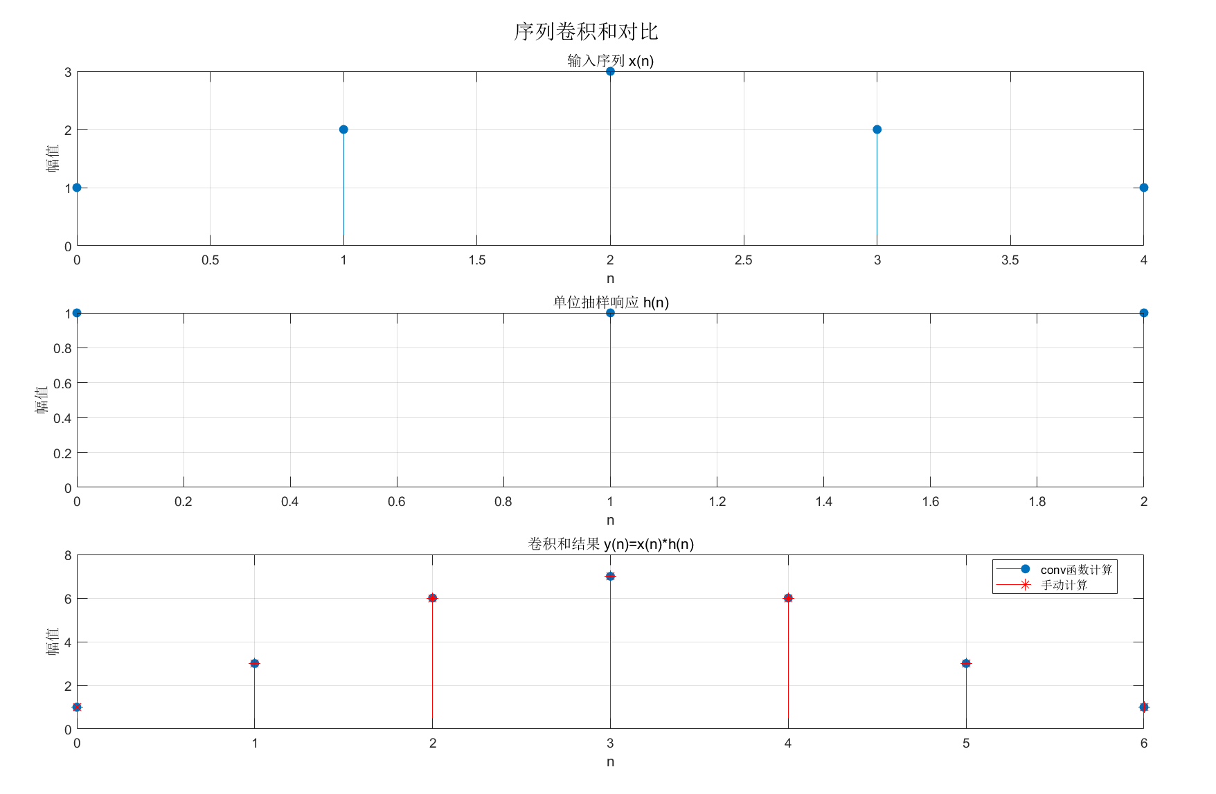 hold on; stem(n_y, y_manual, 'r*', 'MarkerSize',8); % 手动结果用红色星号标注