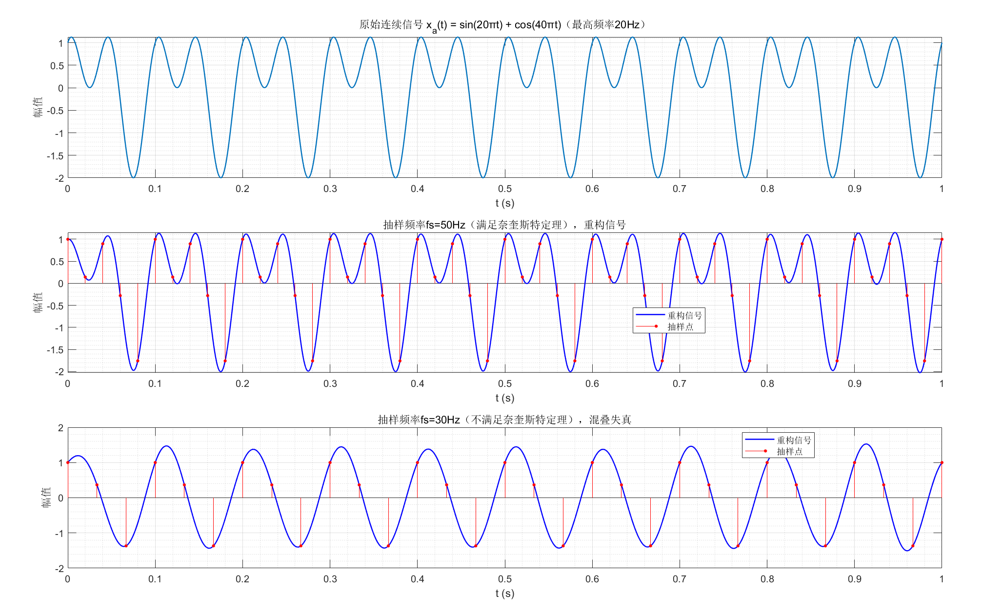 - 不满足抽样定理(fs=30Hz):重构信号出现严重混叠,完全偏离原始信号,直观理解抽样定理的重要性。