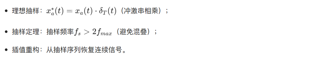 - 抽样定理是连续信号离散化的核心,抽样频率需大于 2 倍最高频率,否则会出现混叠,可通过 sinc 插值重构连续信号。
