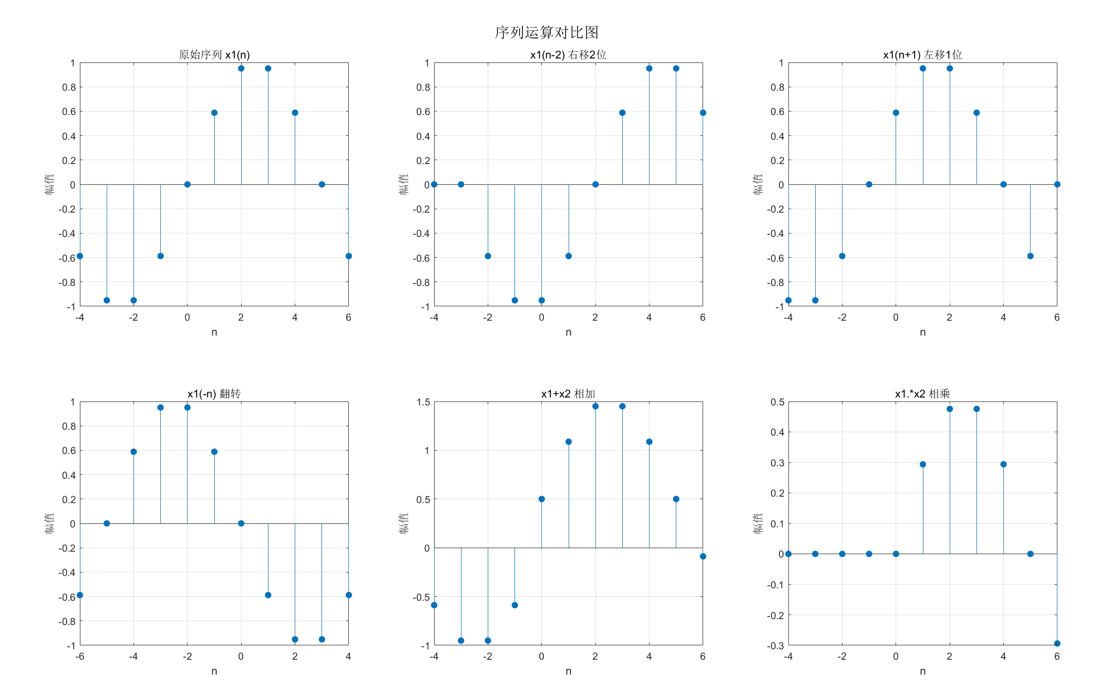 运行效果:同一窗口显示原始序列、移位、翻转、加减乘的 6 张对比图,清晰看到不同运算对序列的影响。