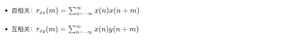 相关性用于衡量两个序列的相似程度,分为自相关(自身)和互相关(两个序列),公式: