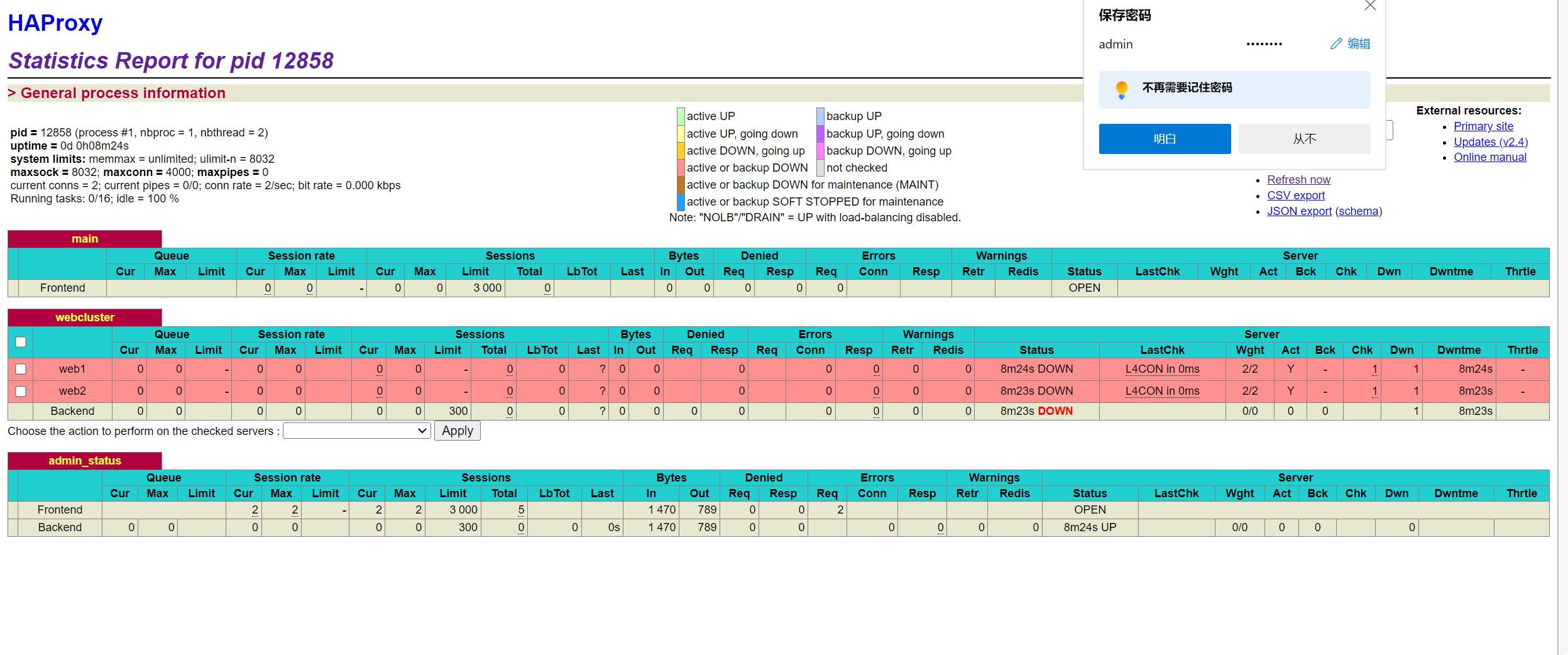 root@lb1 \~\]# systemctl start haproxy \[root@lb1 \~\]# systemctl stop firewalld 打开浏览器访问 [http://192.168.72.100:9129/admin](http://192.168.72.100:9129/admin "http://192.168.72.100:9129/admin") 输出后,会弹出输入用户名和密码的窗口,我们输入在配置文件中配置的用户名(admin)和密码(admin123)后就可以登录成功。登录成功后就可以看到如下的界面了。
