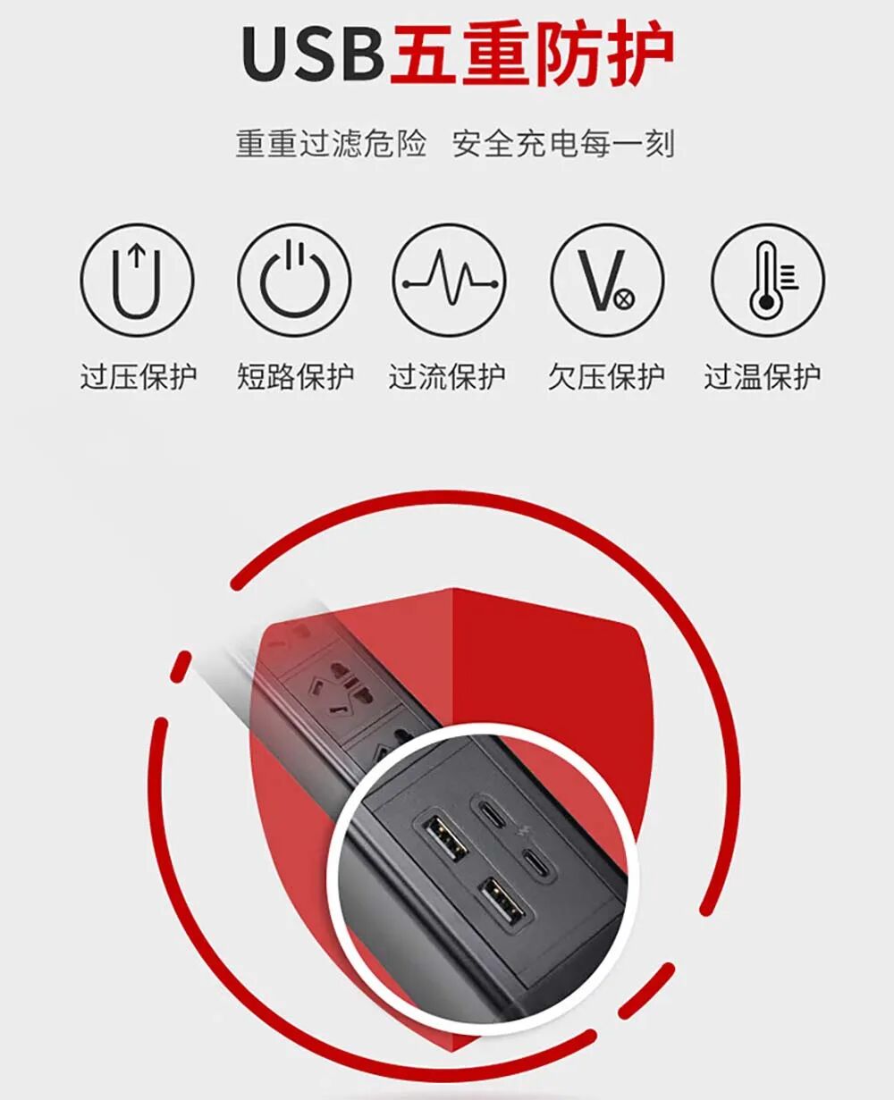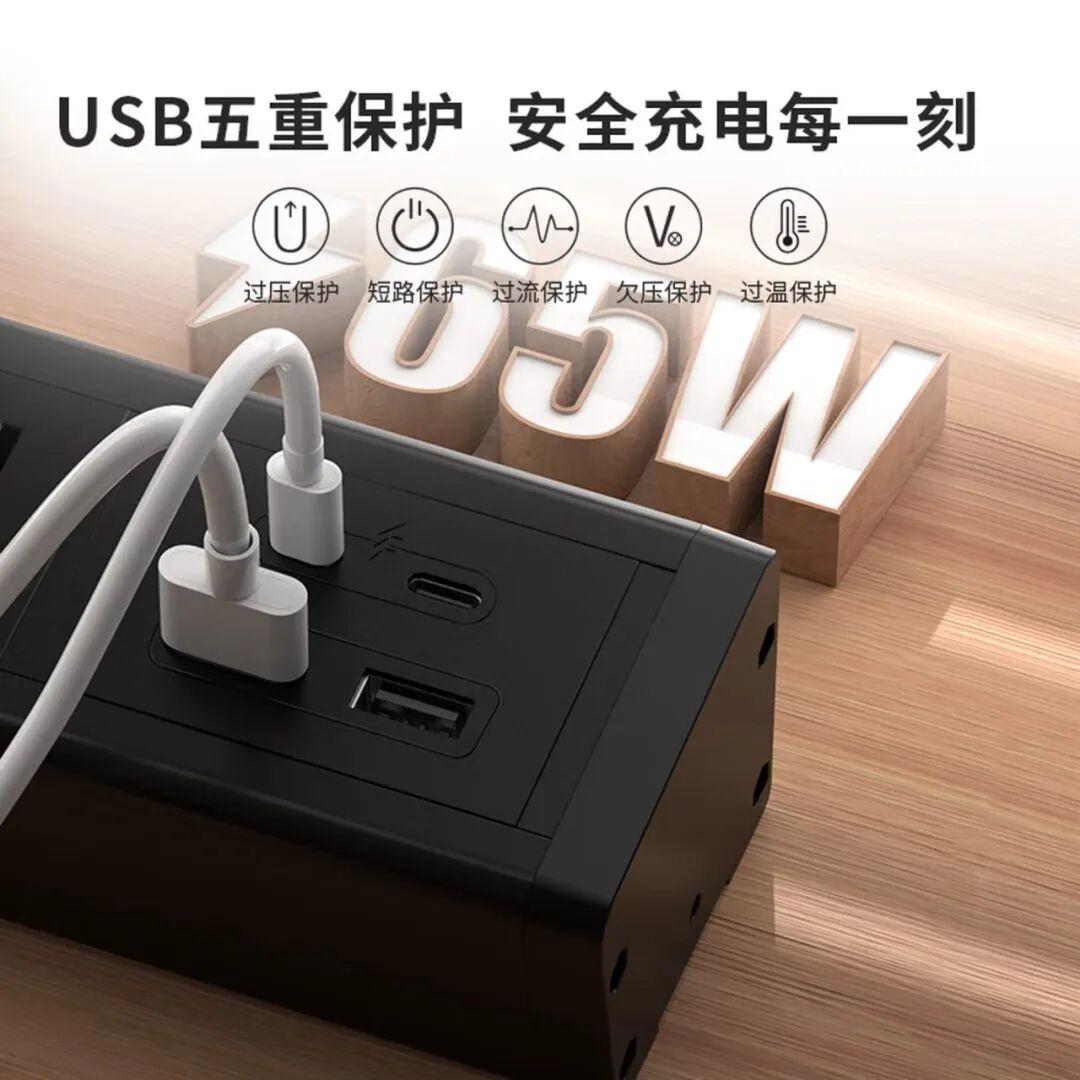 高度集成,一"座"多得:该系列产品创造性地将交流电插座与直流快充模块整合于一体。以热门型号为例,一个插排上不仅提供3至5位10A新国标五孔插座,还配备了2个USB-A接口和2个USB-C接口。这意味着,它既能为你台灯、显示器等传统电器供电,又能直接为手机、平板、笔记本等数码设备进行快充,省去了多数外置充电头。