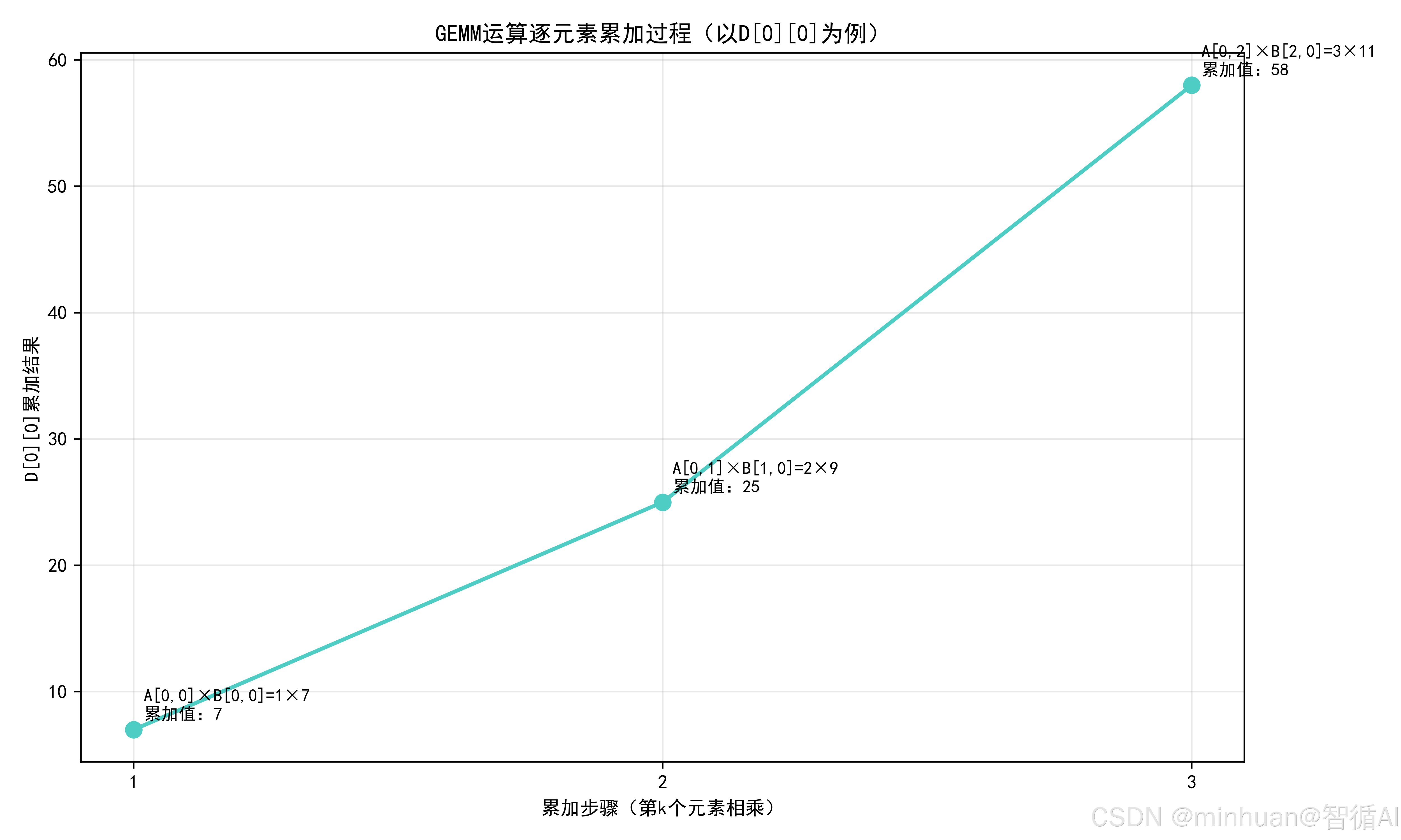 **图示说明:**聚焦D[0][0]元素的三次累加过程,每一步对应A[0][k]与B[k][0]的乘积叠加,直观呈现GEMM"相乘+累加"的核心逻辑,直观的理解单元素计算的底层原理,此处务必了解透彻,为后续高维运算理解打下基础。