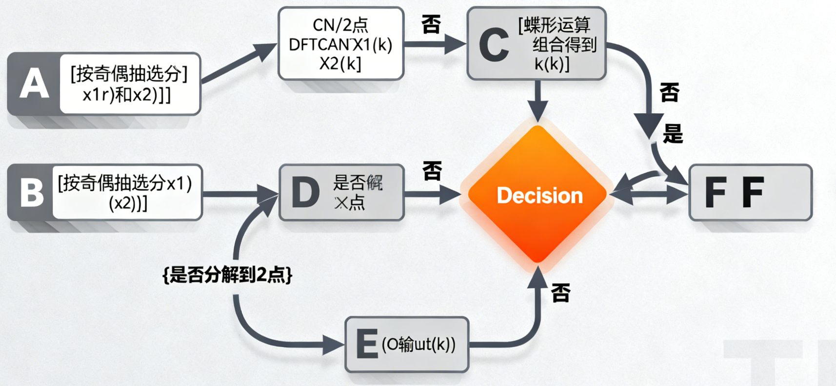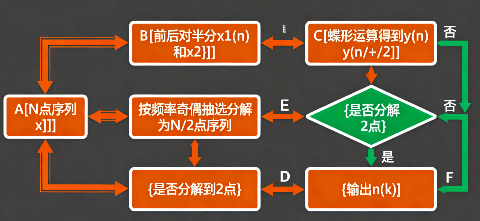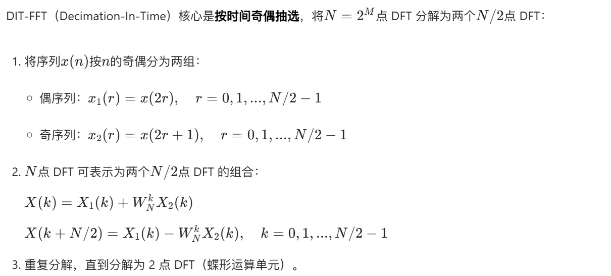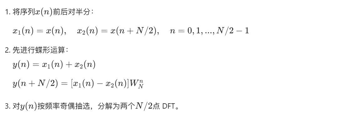 DIF-FFT(Decimation-In-Frequency)核心是按频率奇偶抽选,先进行蝶形运算,再分解序列: