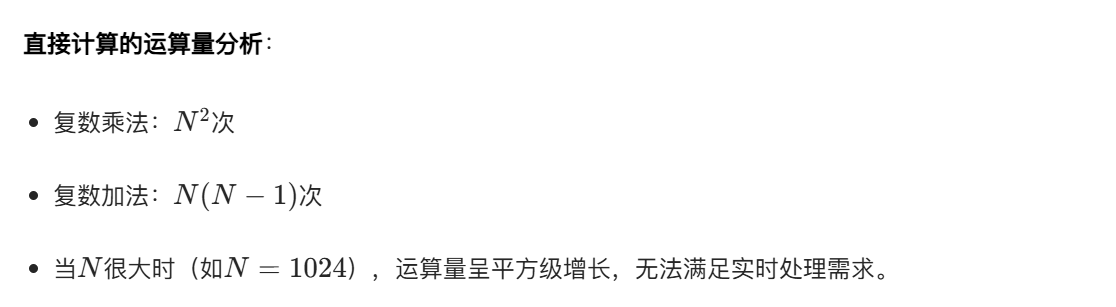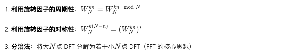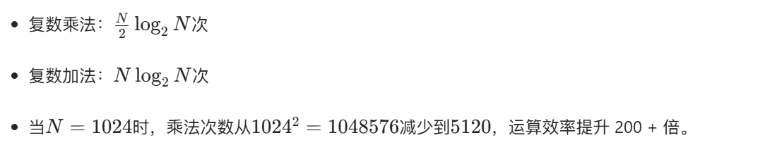 - FFT 核心思想:通过分治法将 DFT 的O(N2)运算量降低到O(Nlog2N),是数字信号处理的核心算法。