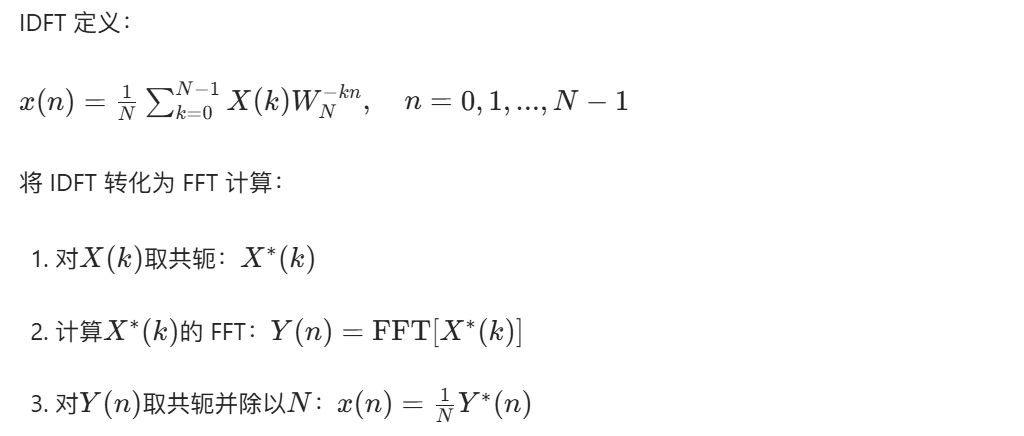 x_ifft = (1/N) * conj(Y); % 取共轭并除以N
