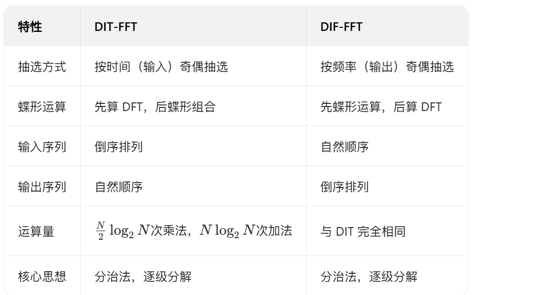- 两类基 - 2 FFT:DIT 按时间抽选(输入倒序),DIF 按频率抽选(输出倒序),运算量相同但实现方式不同。