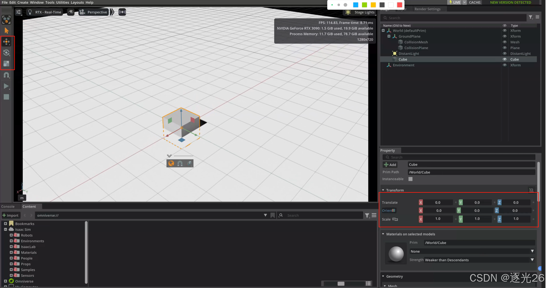 平移W、旋转E、尺寸R调整可以通过左侧菜单栏选择+坐标轴移动实现,亦可通过选中物体修改右下栏相关参数实现,我们平移Z轴为后续重力测试铺垫。