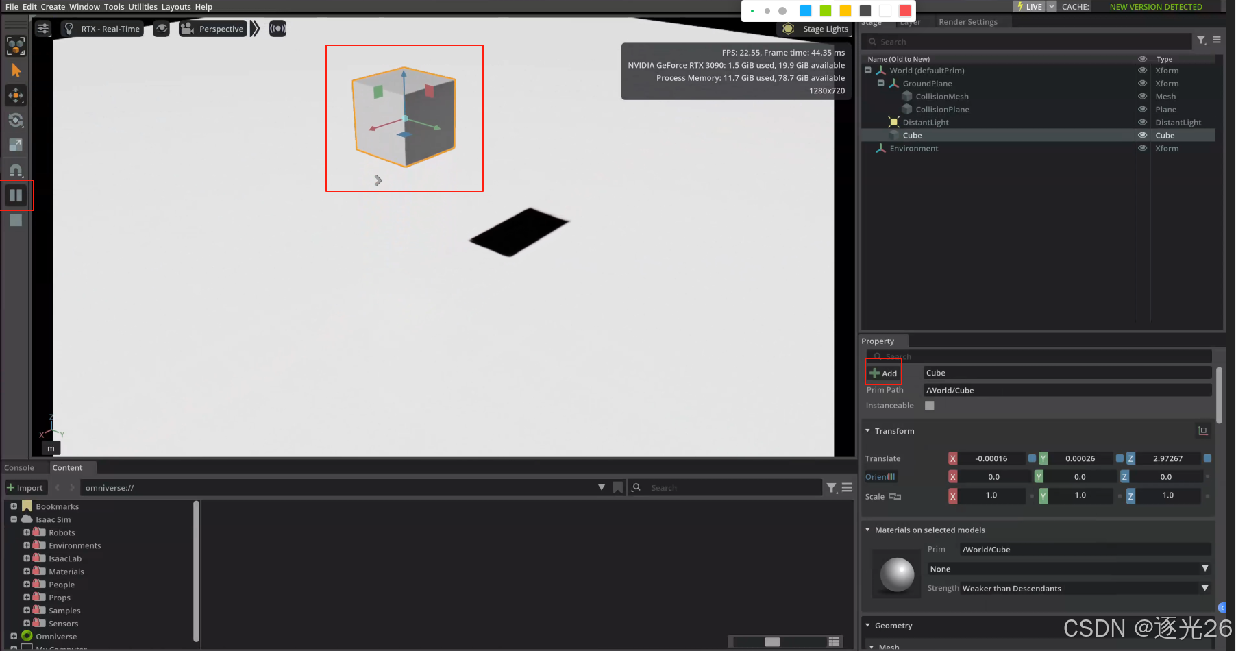菜单栏左上角Create > Shape > Cube。注意此时添加的物体没有物理属性(如质量、惯性矩阵等),需要后续自行添加。