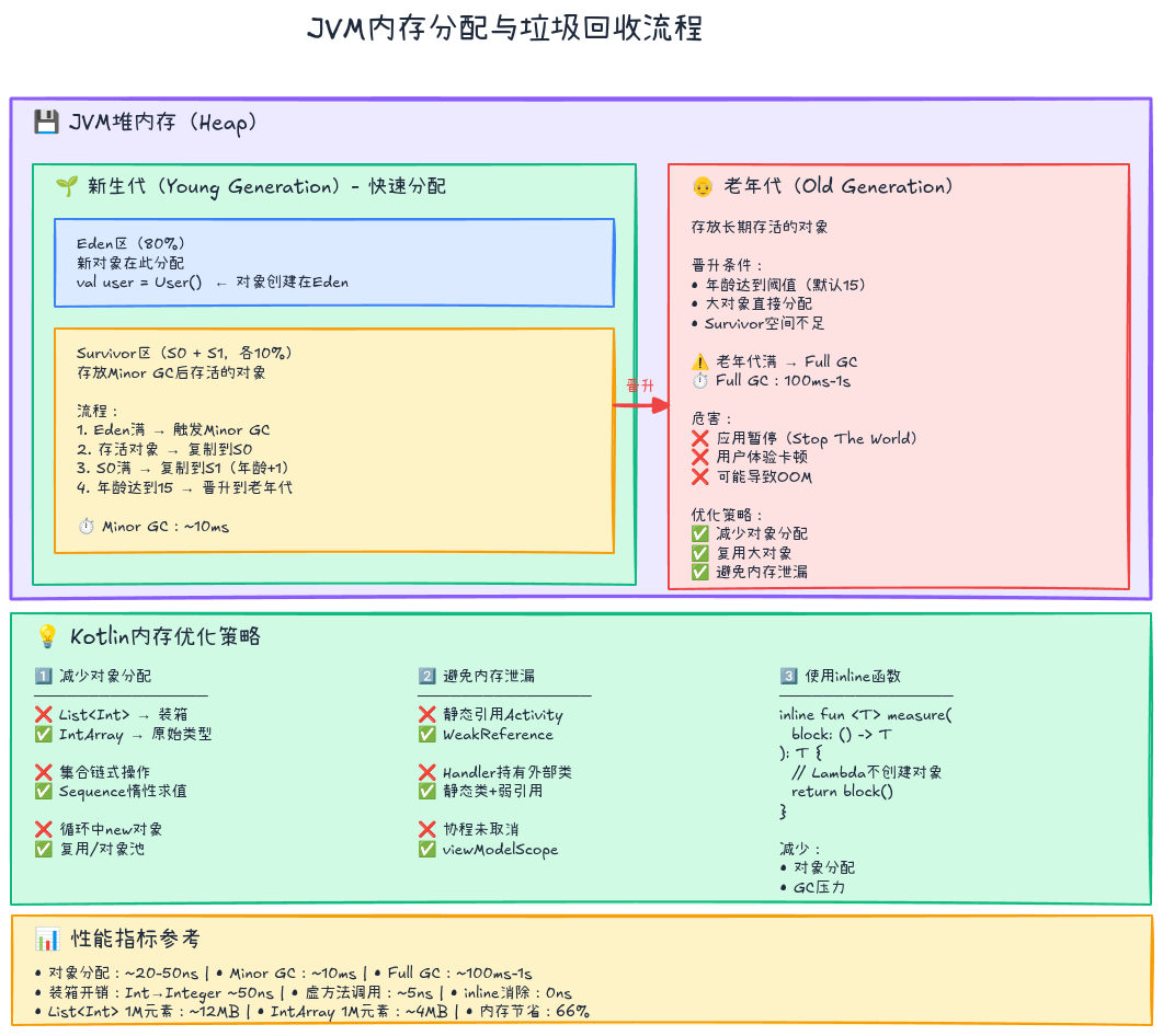 inline函数是Kotlin零开销抽象的核心 - 减少分配:使用Sequence、原始类型数组、对象池减少内存压力