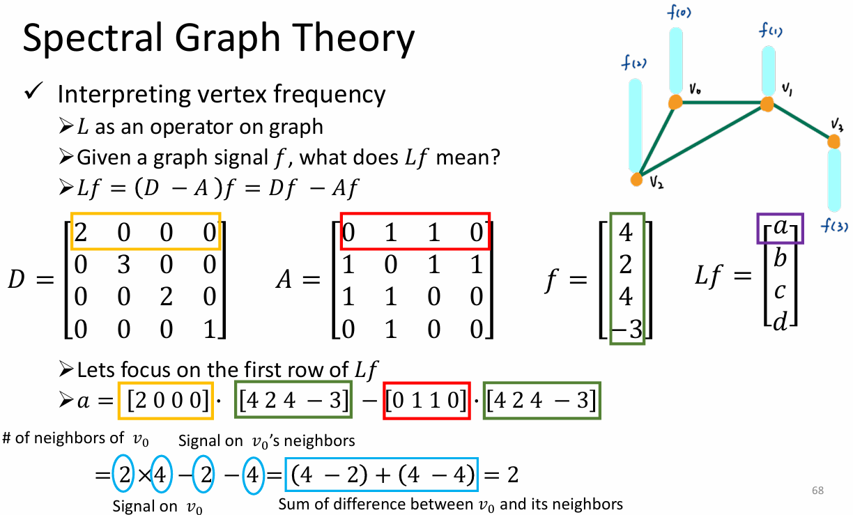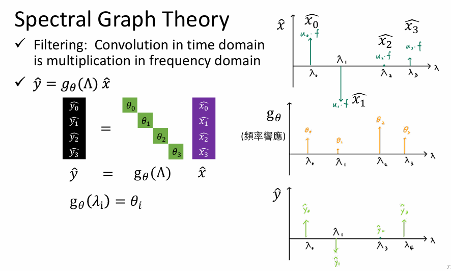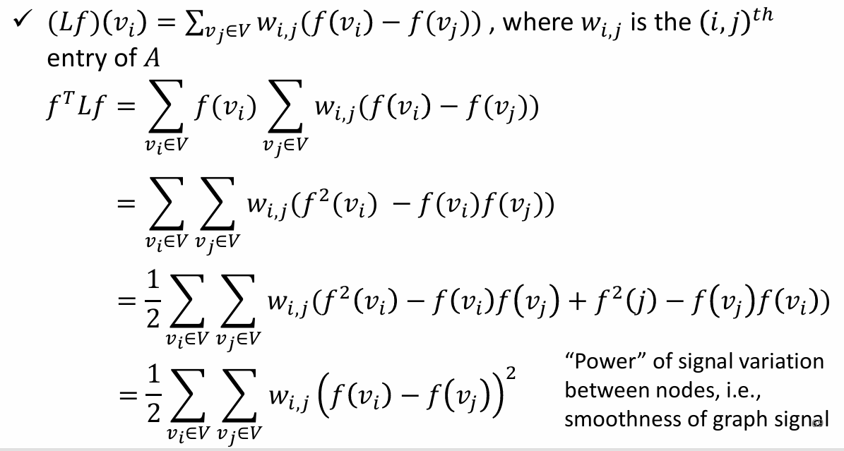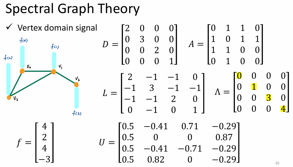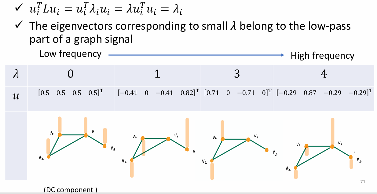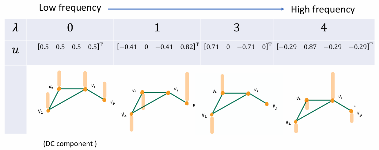 - λ l \lambda_l λl(特征值)越小,代表这个向量在图上变化越平缓(低频,平滑信号); λ l \lambda_l λl 越大,代表相邻节点差异剧烈(高频,噪声或边缘)。这是在不规则拓扑上定义**"频率"**的数学方式。