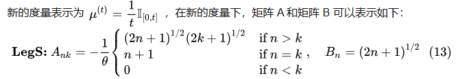 Mamba (基于 HiPPO-LegS) 关心的是过去 [ 0 , t ] [0, t] [0,t] 窗口内的所有信息,且权重相等。我们定义缩放勒让德测度 (Scaled Legendre Measure, LegS):