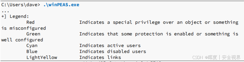 运行 winPEAS.exe,程序需要几分钟 完成扫描。其输出图例采用彩色编码图例,便于快速识别关键信息: